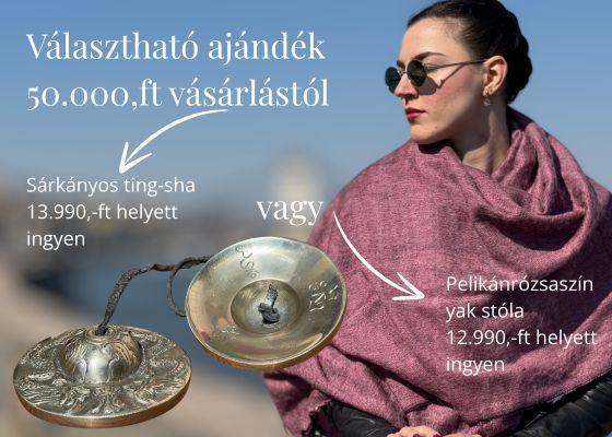 Ha a kosarad értéke legalább 50.000 Ft (bármilyen termék), választhatsz egy pelikánrózsaszín yak stólát vagy egy sárkányos ting-sha-t ajándékba.