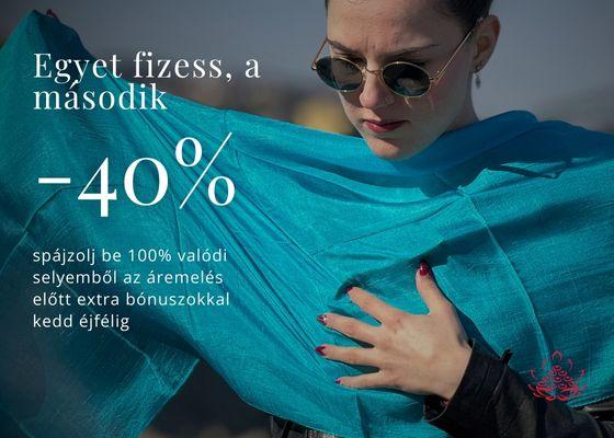 2 db vásárlása esetén az olcsóbbik árából -40% automatikus kedvezményt kapsz: pakolj be minimum 2 db bármilyen 100% valódi hernyóselyem sálat a kosaradba és az olcsóbbat automatikusan -40% engedménnyel számolja a rendszer.