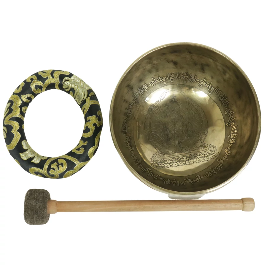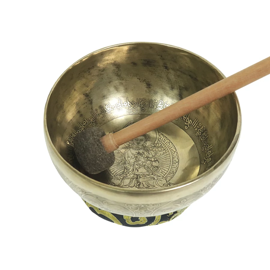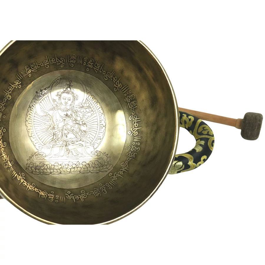 Zöld Tara tibeti mantrás hangtál 7 fémből zöld színű brokáttal és ütővel - videoval