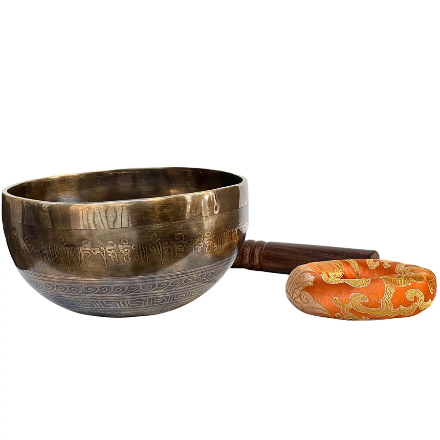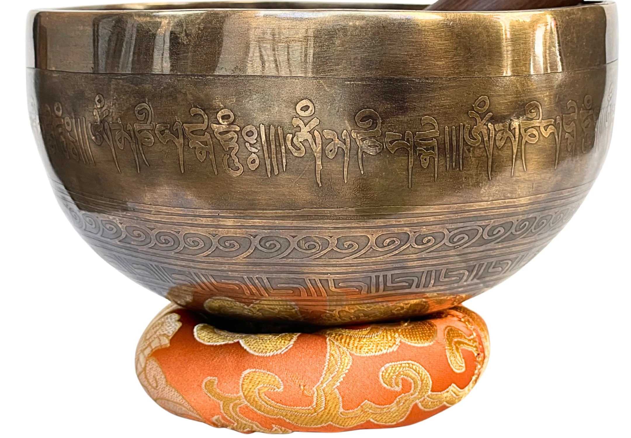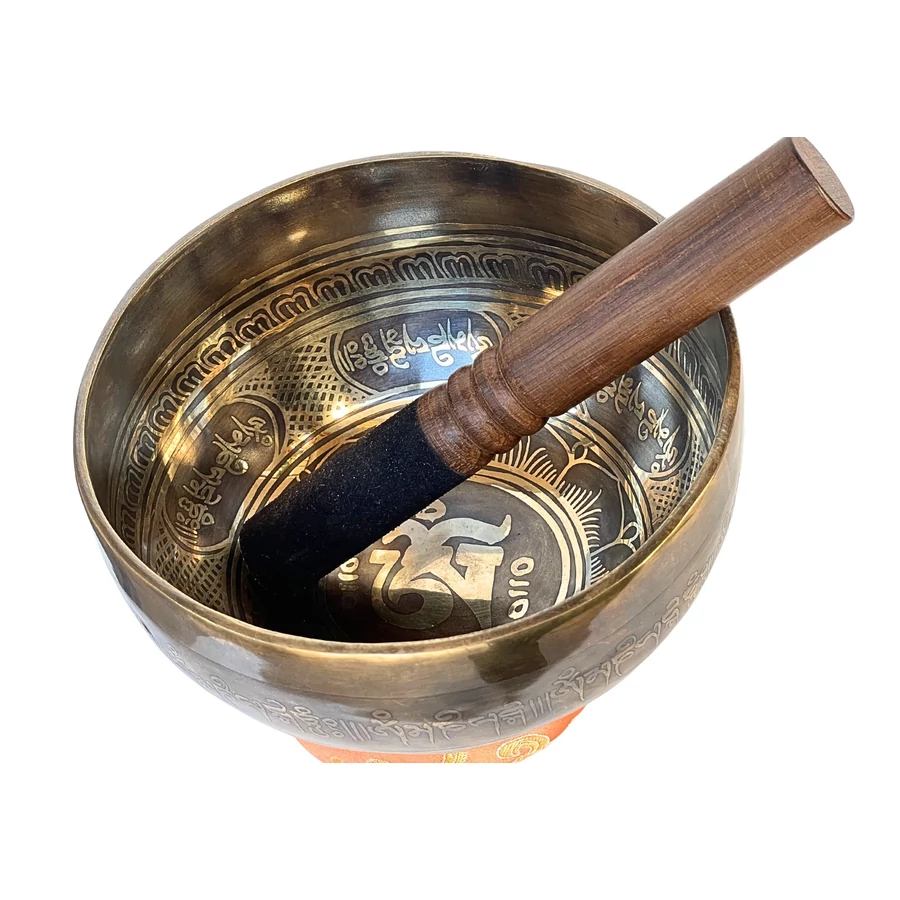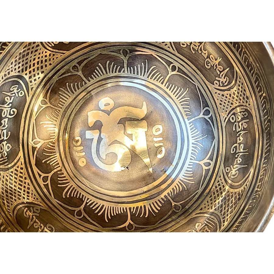 Belsejében a tibeti OM szótag ragyog – az univerzum teremtő hangja, amely minden más rezgés forrása. Oldalán az Om mani padme hum mantra fut körbe, mintha minden betű egy apró imát suttogna. Az alján az Élet Virága díszlik, az örök harmónia szimbóluma, amelyben a teremtés rendje, a teljesség és az egység lüktet.
