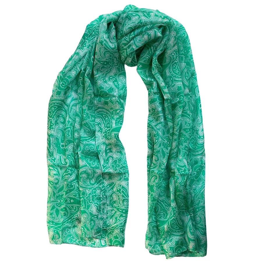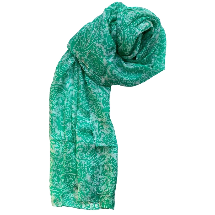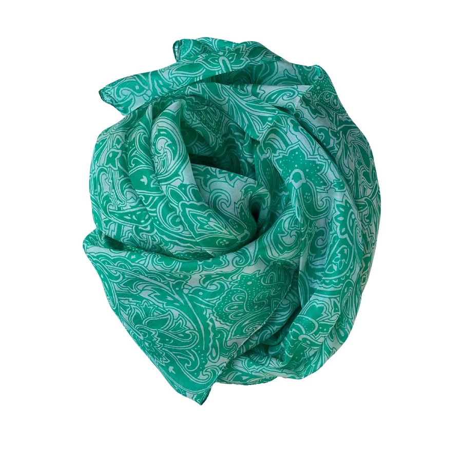 A habfehér alapon írzöld mintás, valódi hernyóselyemből készült sál a tavasz friss levegőjét és a természet ébredésének energiáját idézi. A habfehér alap légies, tiszta hatású, amely tökéletes hátteret ad az írzöld vidám, mégis elegáns mintáinak. Az írzöld tónusa friss, üde, enyhén hideg árnyalat, amely kiemeli a bőr természetes fényét és az arc frissességét.