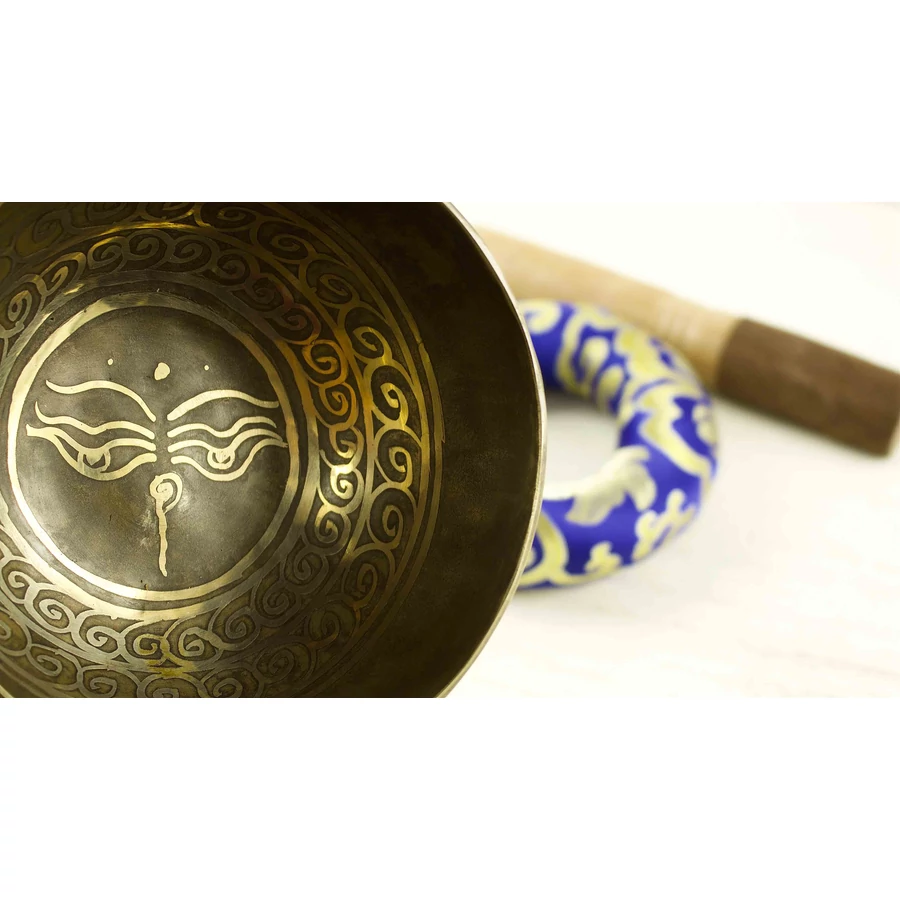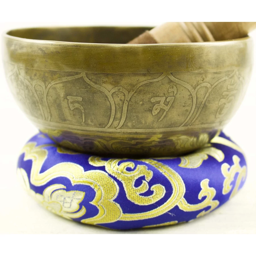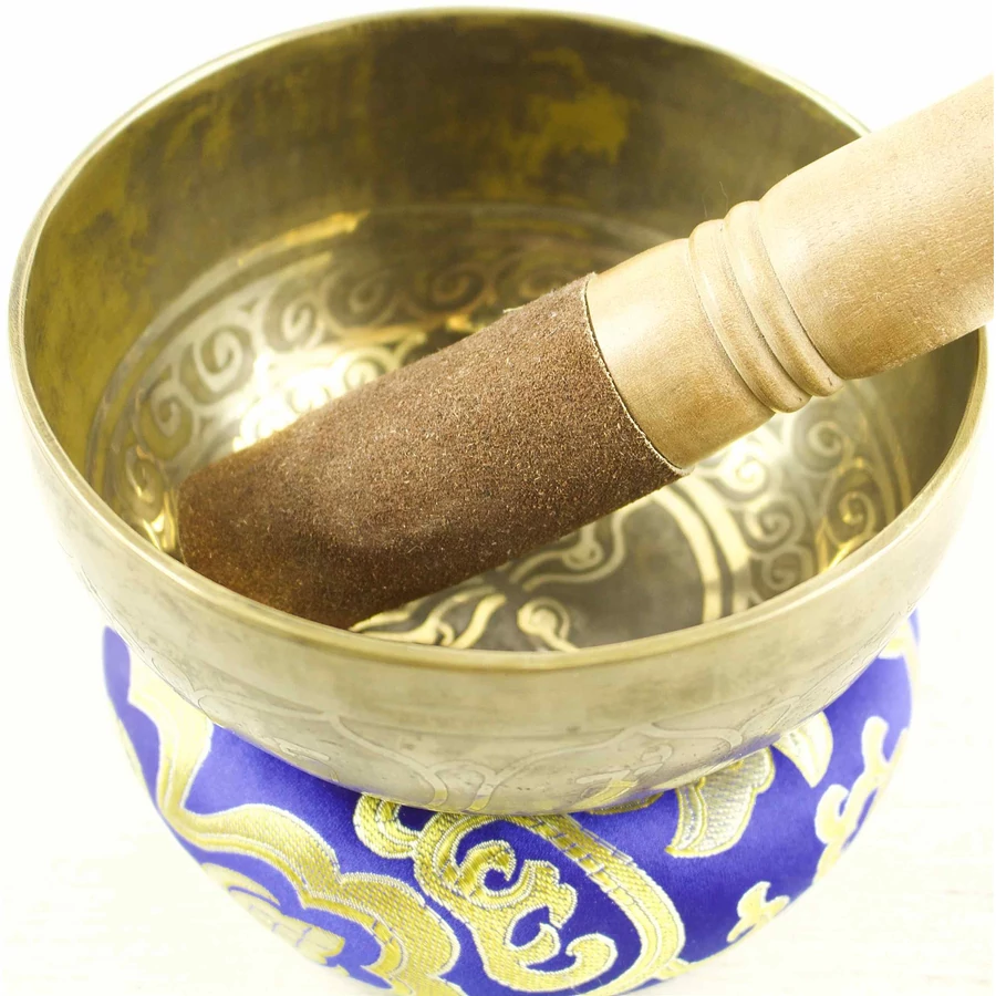 Terápiás tibeti hangtál 7 fémből bőrrel bevont fa ütővel, kék brokát alátéttel - videoval