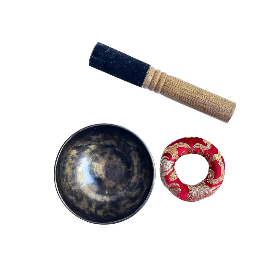 11 cm átmérőjű, 5.7 cm magas – tökéletes arányok egy kiegyensúlyozott hanghoz. Amikor a bőrrel bevont faütő finoman hozzáér, a hangtál B-hangon, 466 Hz-en szólal meg – ez a koronacsakra frekvenciája. A hang tiszta, fényes, légies – mint egy finom szellő a hegytetőn. Rezgése a fejtetőnél érezhető: megnyitja az elmét, és összekapcsol a magasabb tudattal, ahol minden mozdulat békét talál.