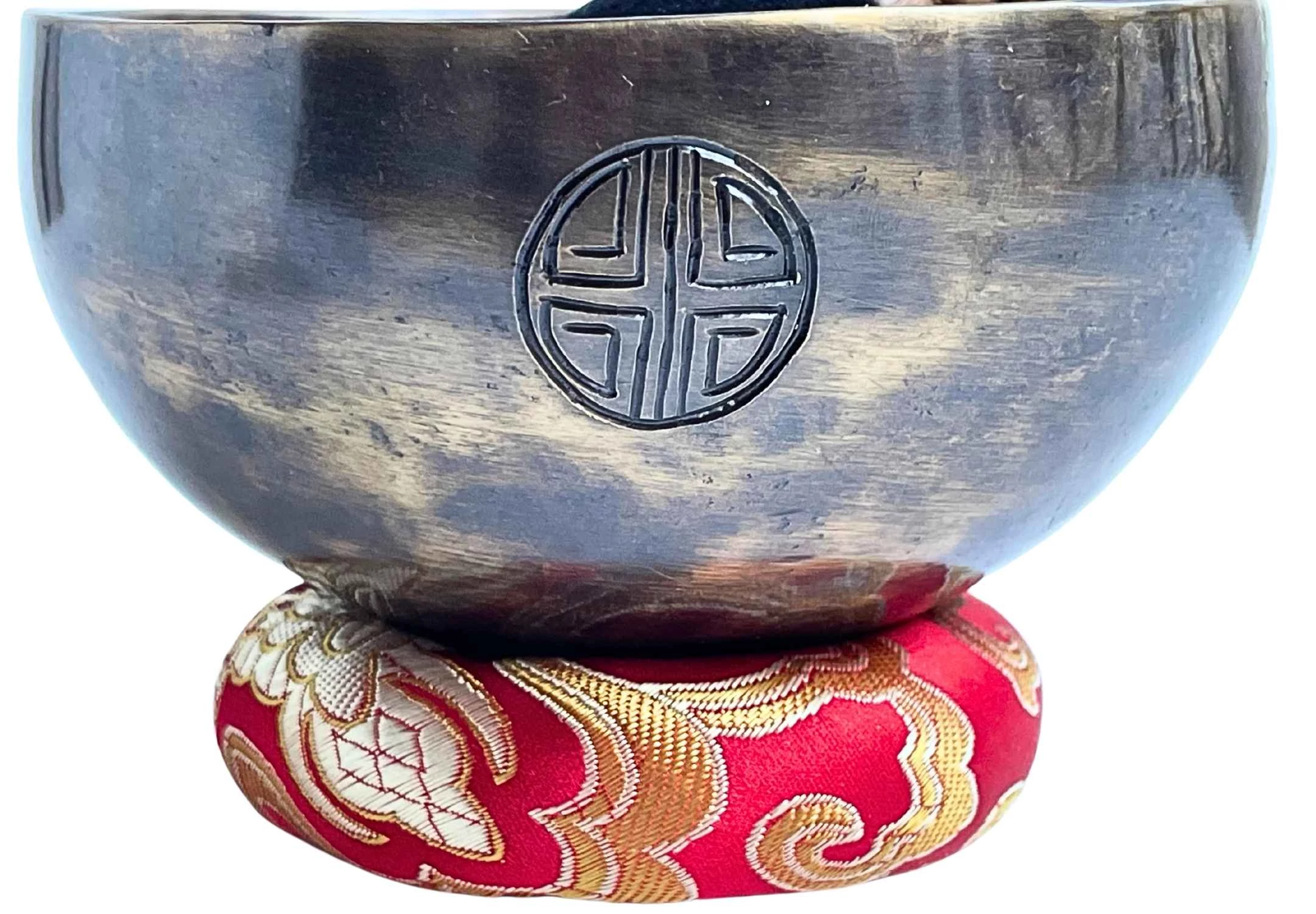 A hangtál piros brokát alátéten pihen – a szín a vitalitás és az élet örömének szimbóluma. A vörös energia földeli a koronacsakra fényét, segít egyensúlyba hozni a szellemit és a fizikai valóságot. A hang és a szín így tökéletes egységet alkot: fény és tűz, csend és erő.