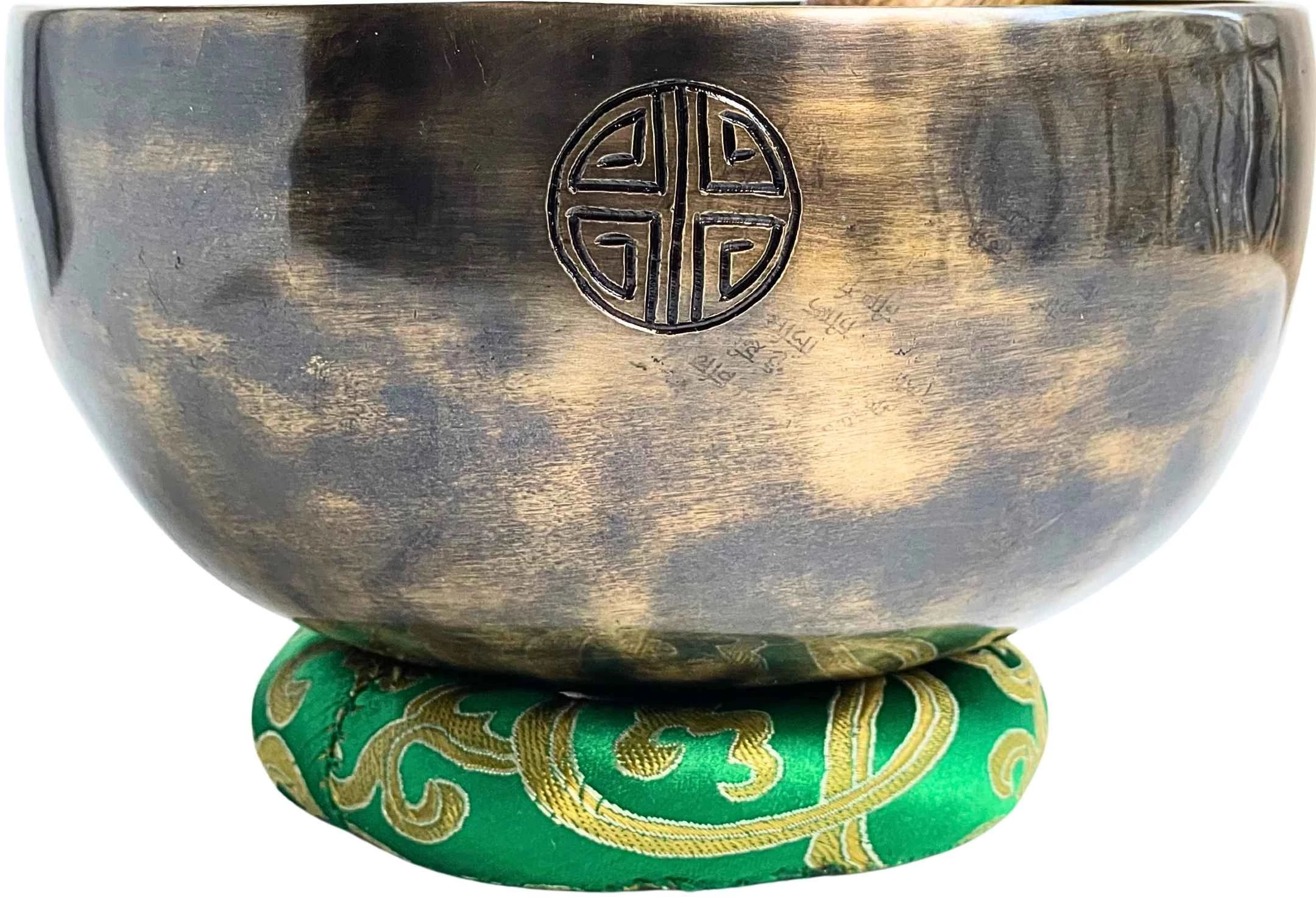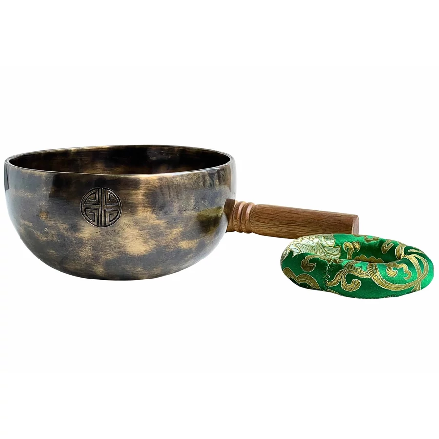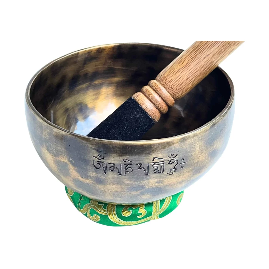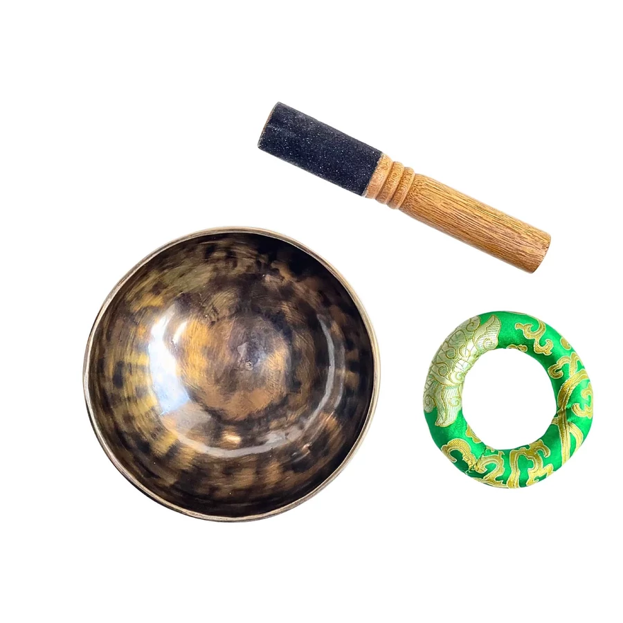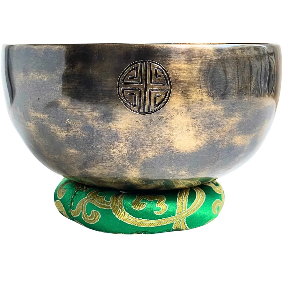 A hangtál zöld brokát alátéten pihen – a természet és az élet színében. A zöld a szív és a torok közötti átjáró: megteremti a harmóniát az érzés és a kifejezés között. Ez a hangtál nemcsak megszólal, hanem hangja a béke hídját is megépíti – belülről kifelé.
