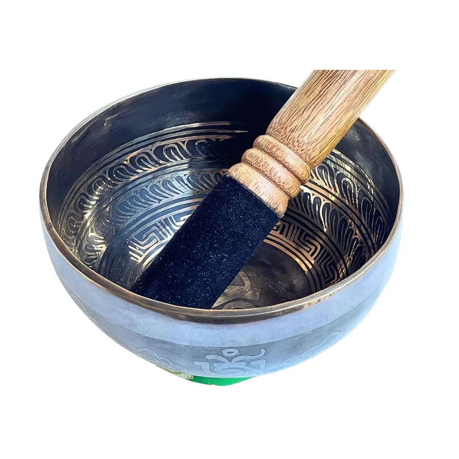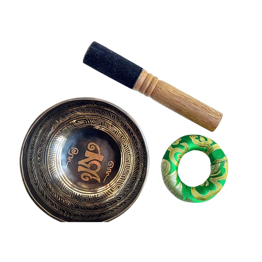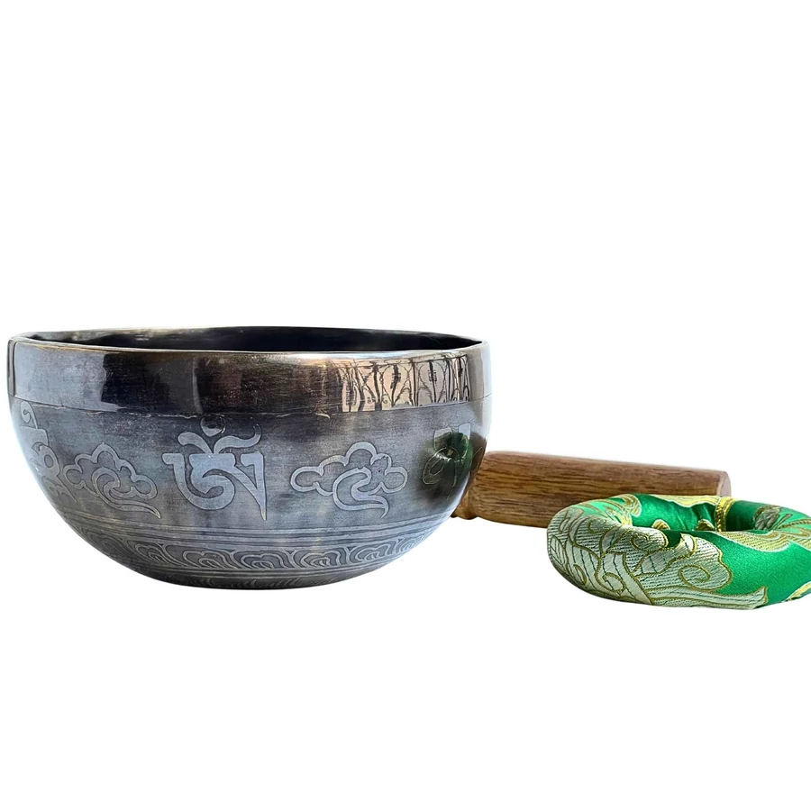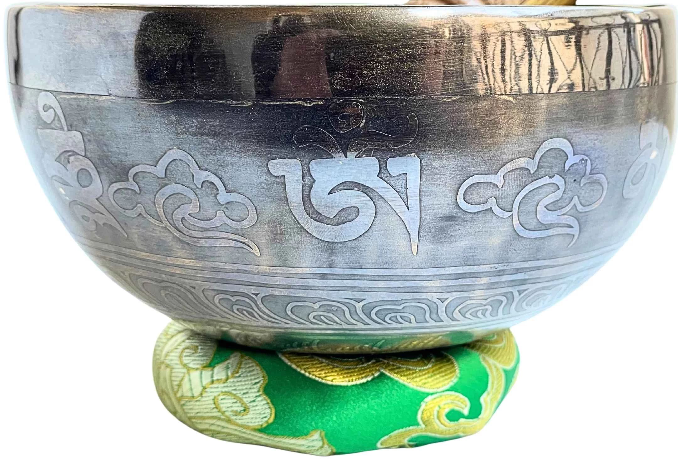 A zöld brokát alátét a harmónia, az egyensúly és a megújulás színe. A tál súlya és mérete adja a hang mélységét, a rezgés finomsága pedig a fényét. Amikor megszólal, a tér megtelik aranyló nyugalommal – mintha a levegő is lélegezne.