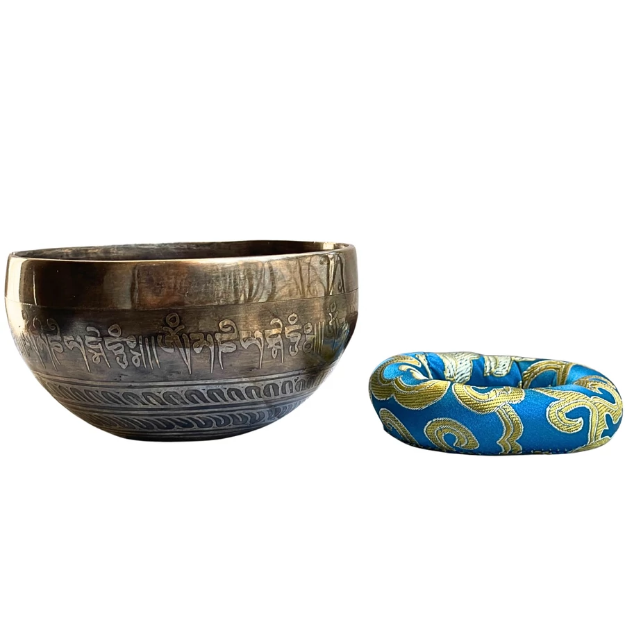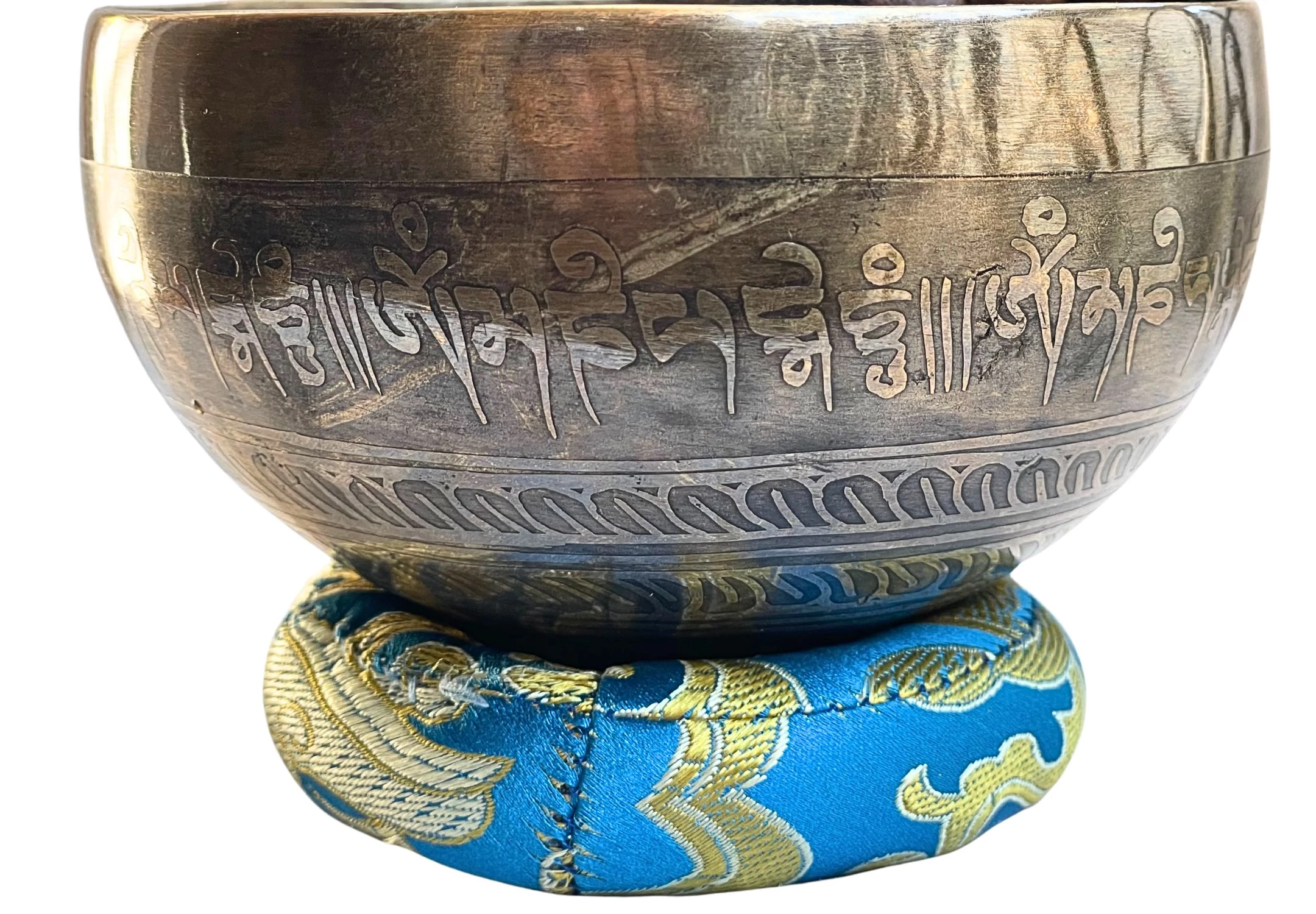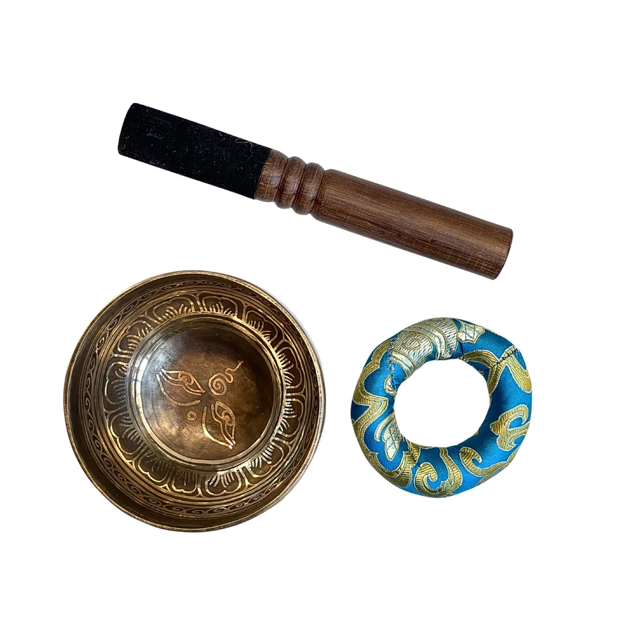 A hangtál 10,5 cm átmérőjű, 5,7 cm magas, 327 gramm súlyú. A türkiz brokát alátét a nyugalom és a tisztulás színe, a bőrrel borított faütő lágy, mégis mély hangot ébreszt. Nézd meg a fotókat, fedezd fel a kidolgozás finomságát. Indítsd el a videót, hallgasd meg a hangját – érezd, ahogy a rezgés lehorgonyoz és megerősít belül.