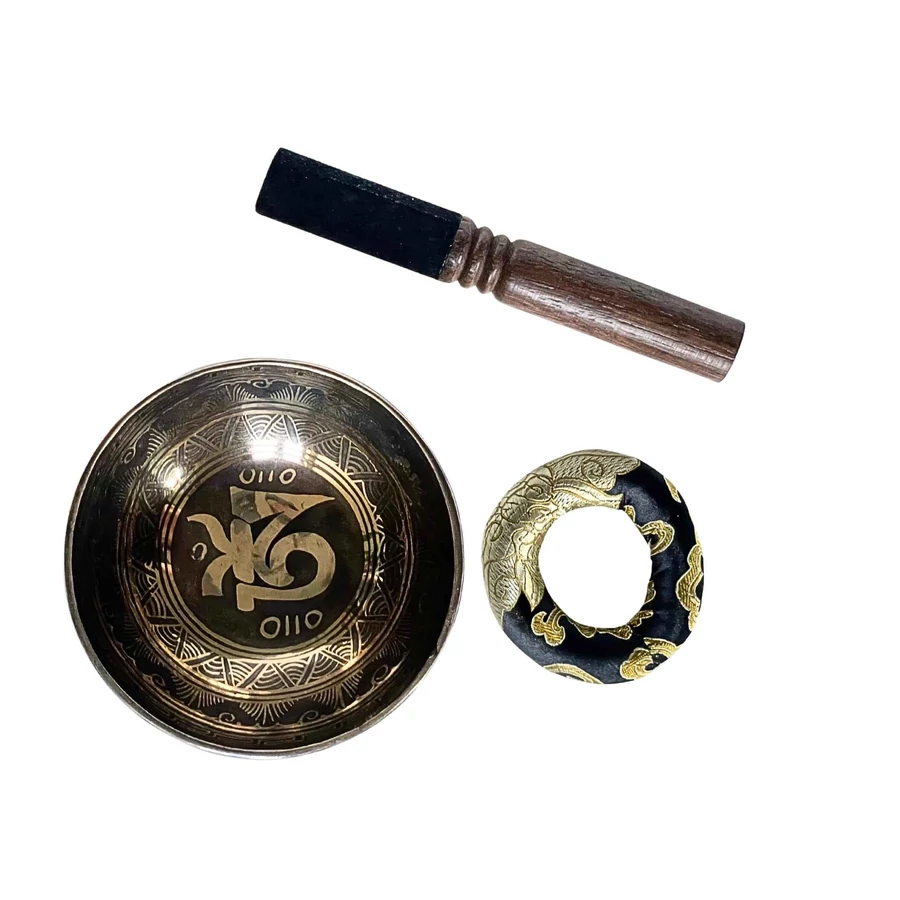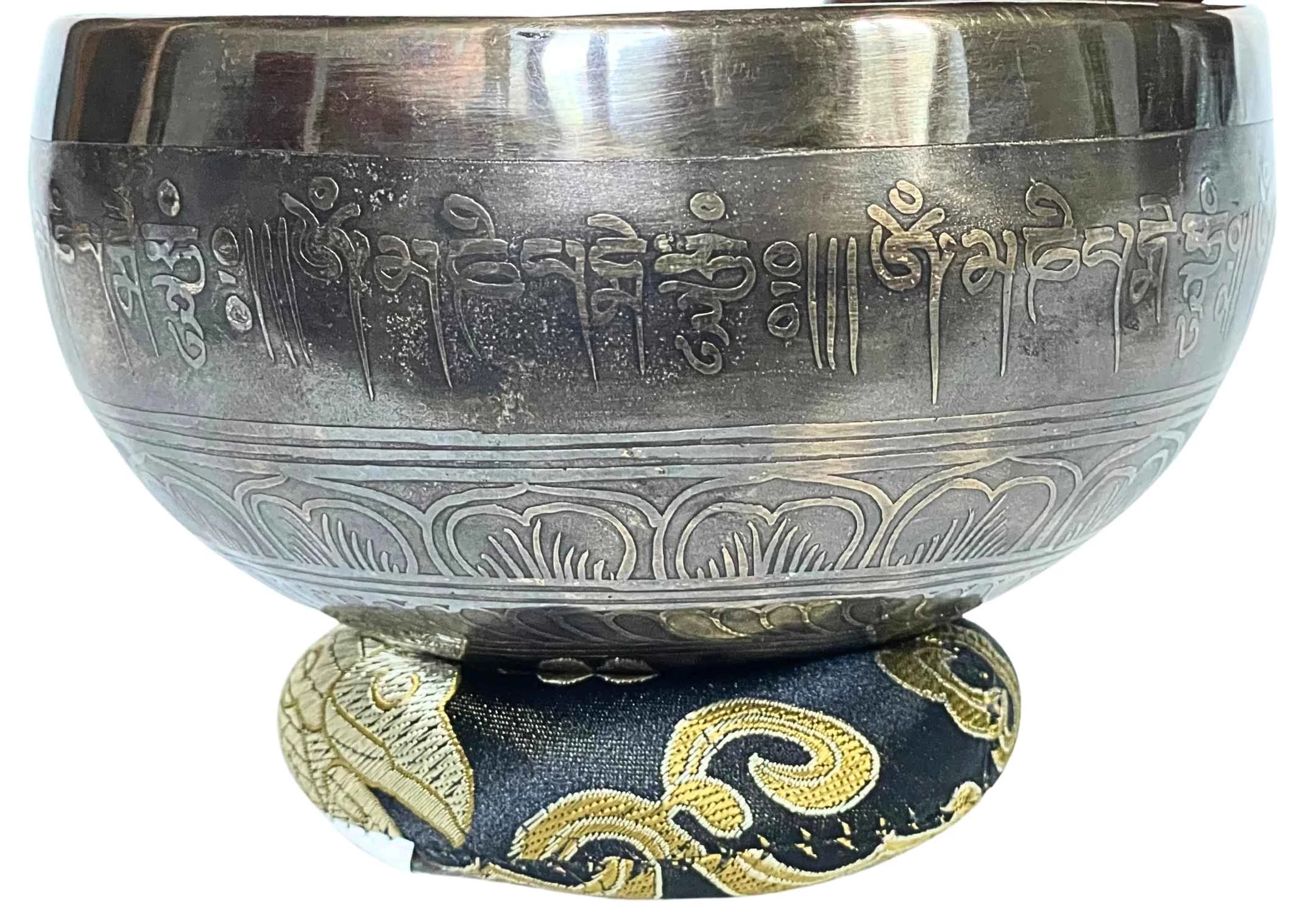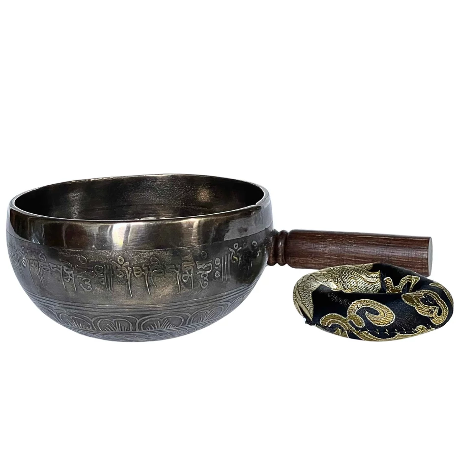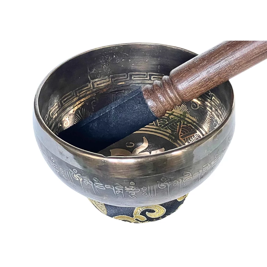 Fekete-arany színű brokát alátéttel érkezik, amely méltóságot és eleganciát sugároz, kiemelve a kézműves kidolgozás aranyló részleteit. A bőrrel bevont fa ütő nemcsak kényelmes fogású, hanem telt, gazdag hangindítást biztosít. Súlya 514 gramm, átmérője 12,9 cm, magassága 7 cm – erőteljes, stabil hangzásra képes méret, ideális meditációhoz és hangterápiához.