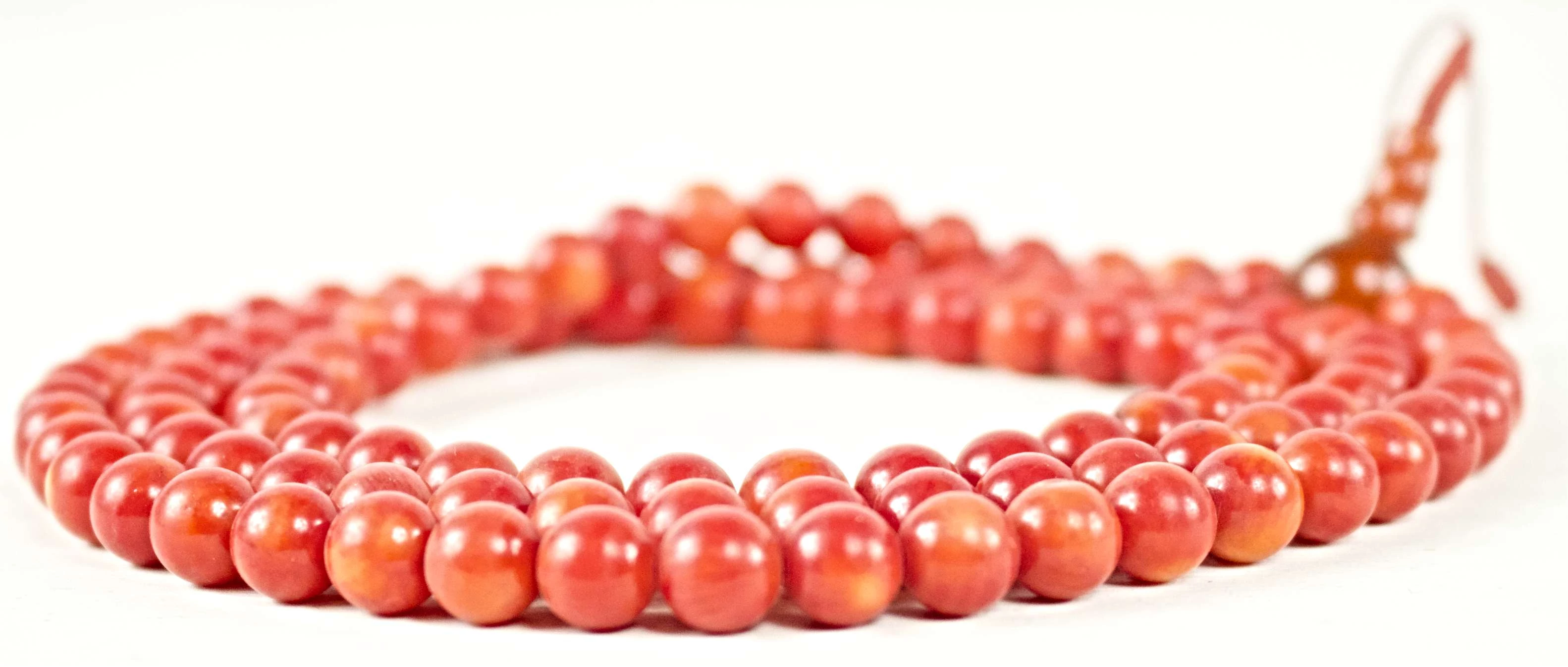 Tradícionális tibeti buddhista 108 szemes mala ( imafüzér ), valódi hegyi korallból. 82 cm kerületű Olvasd el itt a részletes leírást »