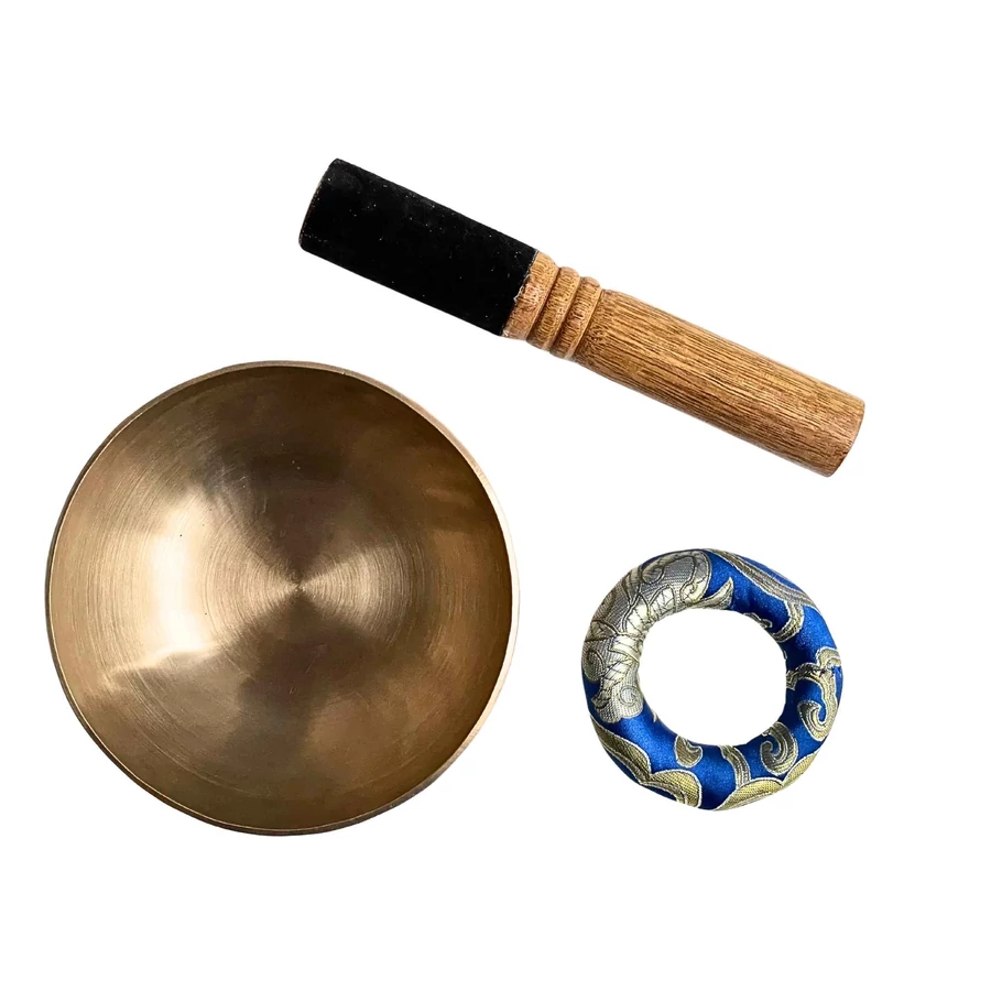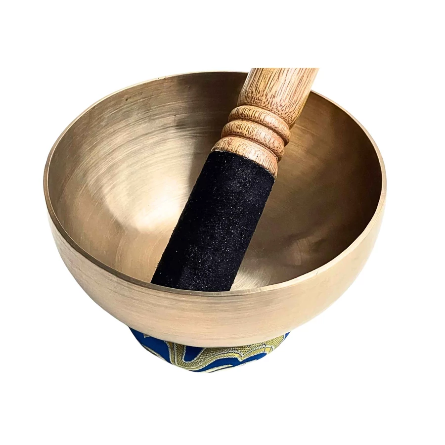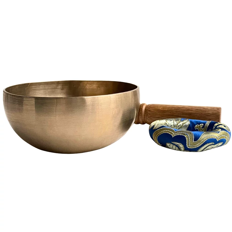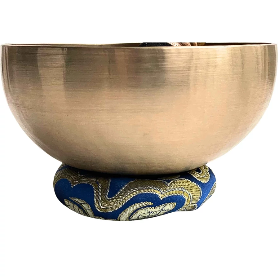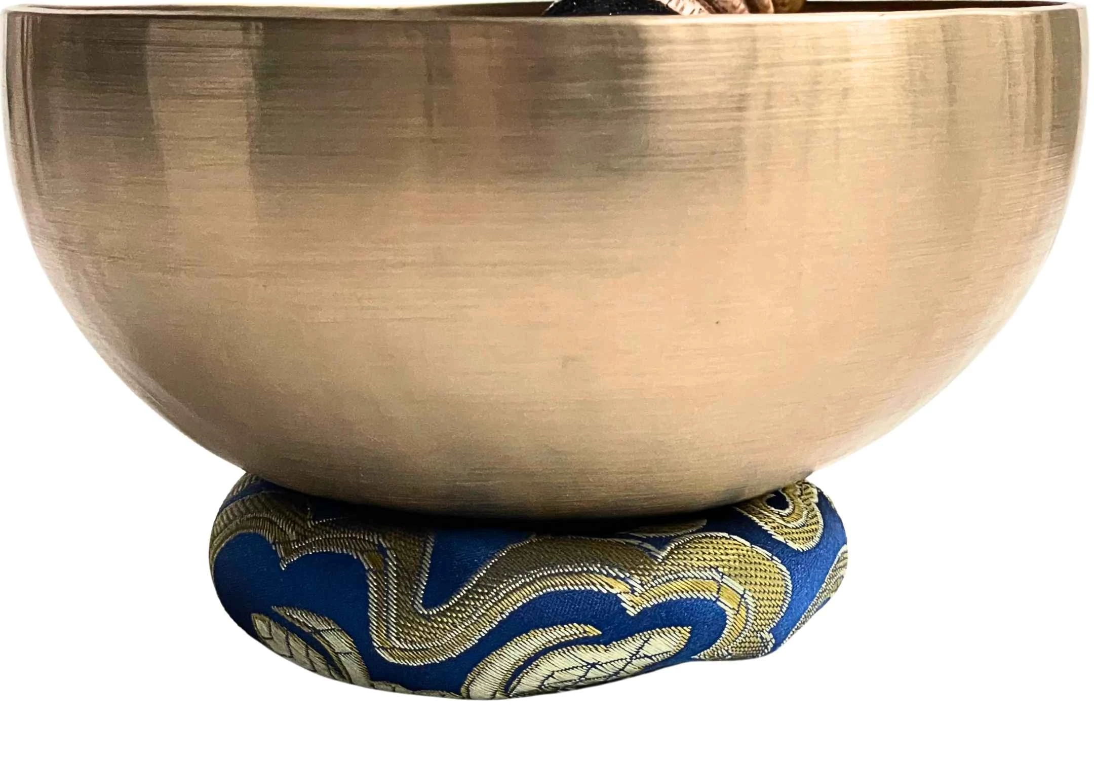 A hangtál kék brokát alátéten pihen – a szín a belső tisztaságot és nyugalmat hordozza. A kék a tudatosság színe, amely segít tisztán látni, miközben a napfonat arany energiája életet visz mindenbe. Ez a hangtál nemcsak hangot ad, hanem fényt gyújt benned.