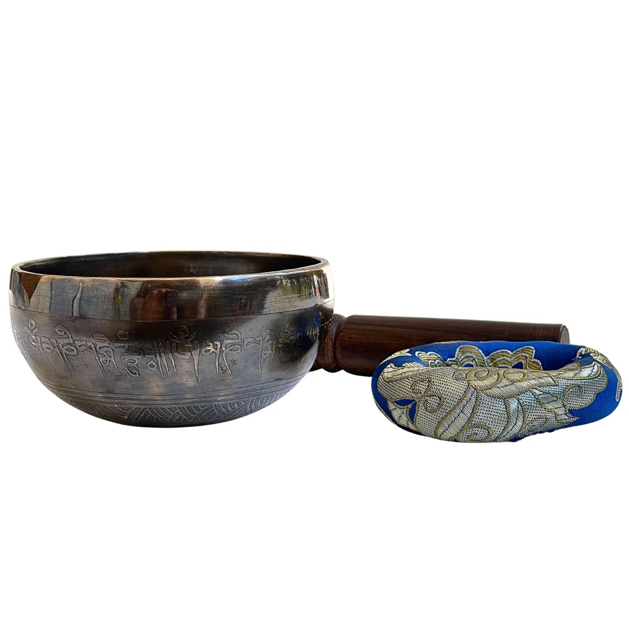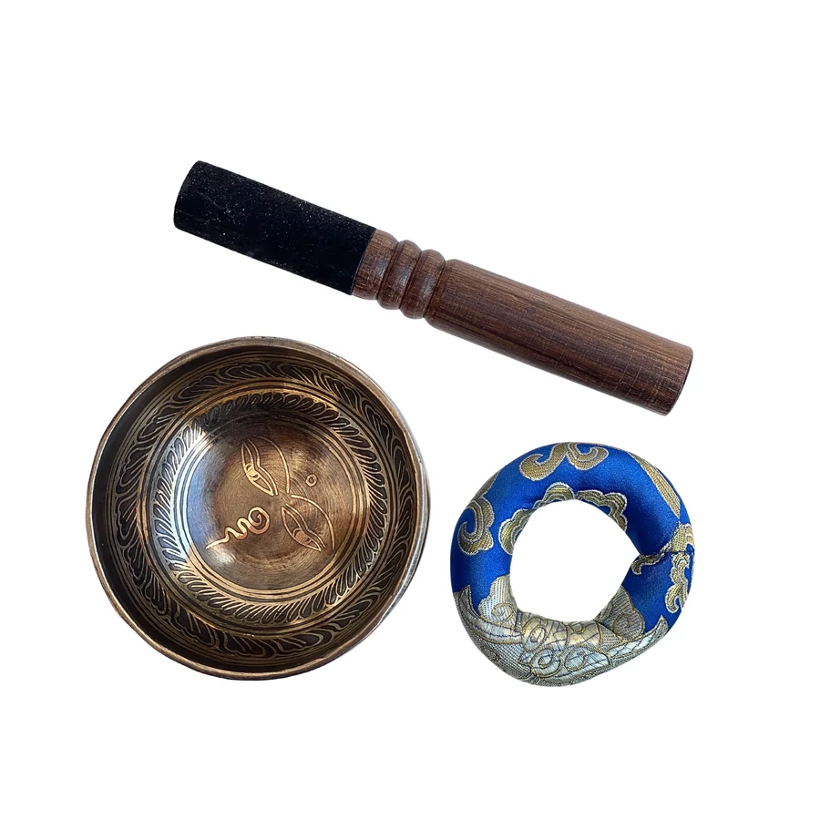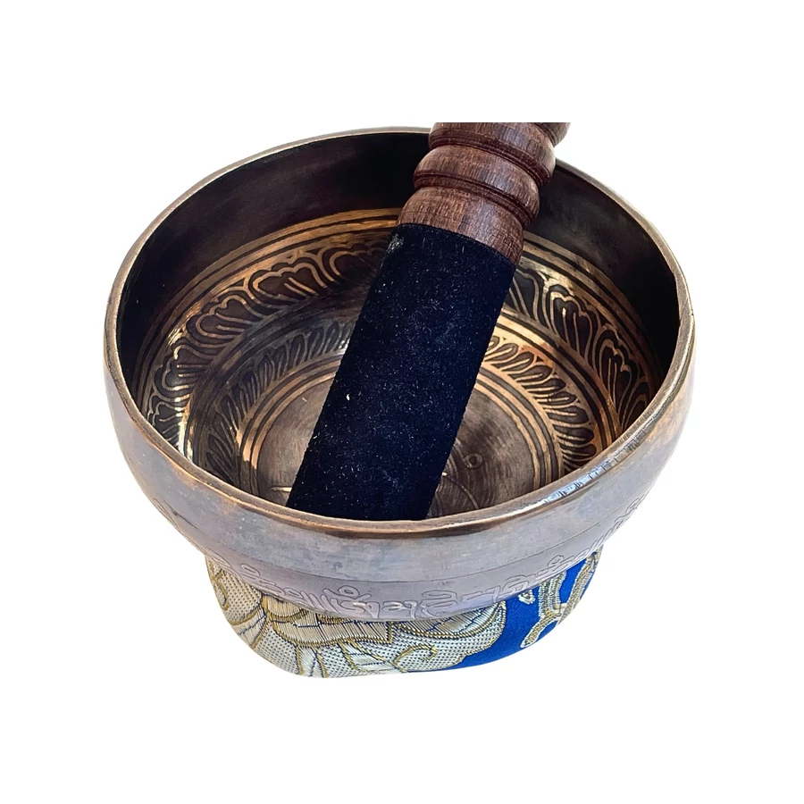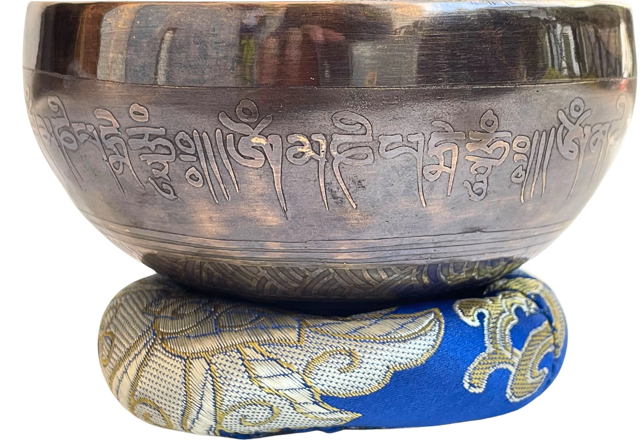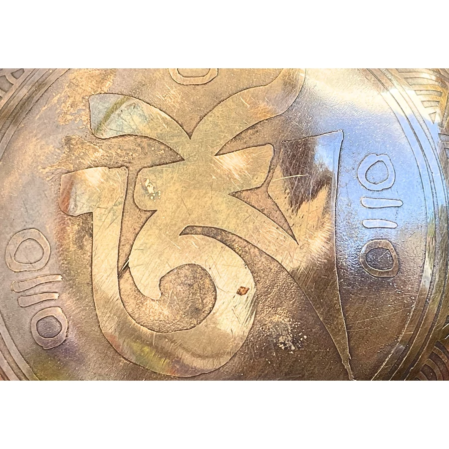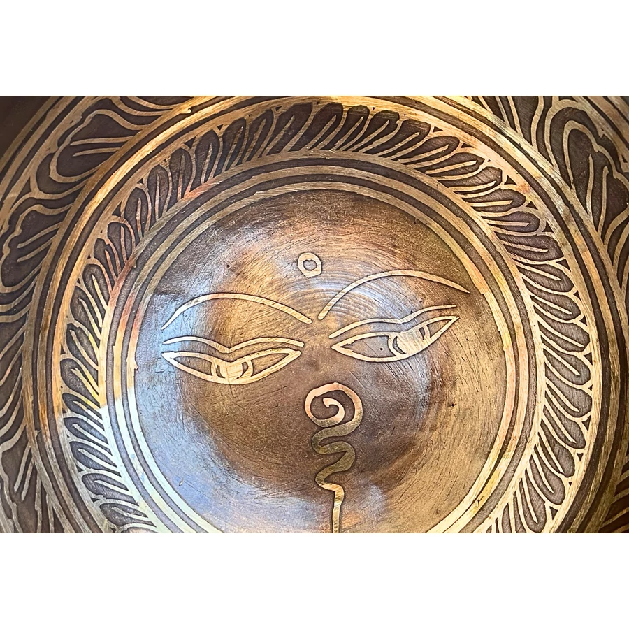 Ez a hangtál a csend és a fény találkozása. Belsejében Buddha Bölcsességszeme figyel – nem kívülről, hanem belülről lát. Emlékeztet arra, hogy a megértés nem a szemmel kezdődik, hanem a tudat tágasságában. Az oldalán az Om mani padme hum mantra fut körbe, a szeretet és az együttérzés hullámzó rezgésével. Az alján az OM szótag lüktet, az ősi teremtő hang, minden kezdet forrása.