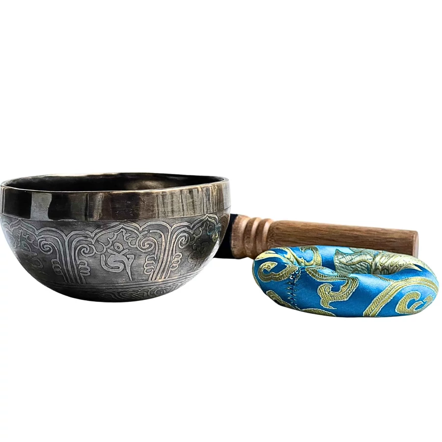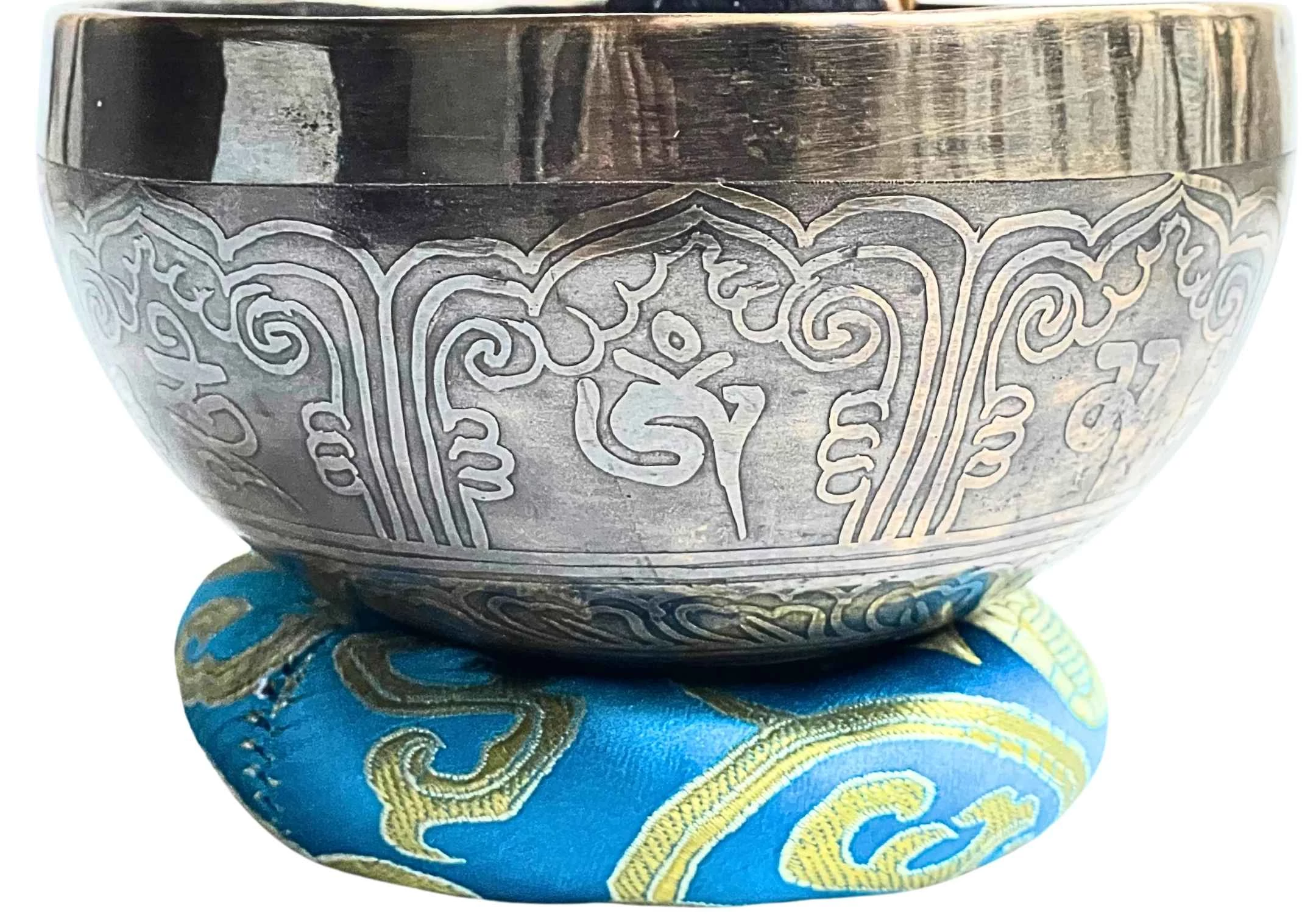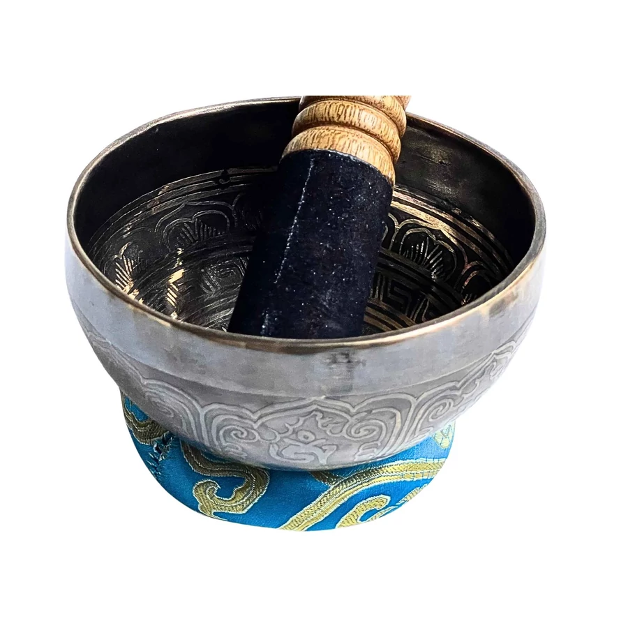 A hangtál türkiz brokát alátéten pihen – a víz és a levegő találkozásának színe, amely harmóniát és nyugalmat hoz a térbe. Egyedi kidolgozás, kézműves részletekkel, amelyek minden rezdülésben ott őrzik a mester keze nyomát.