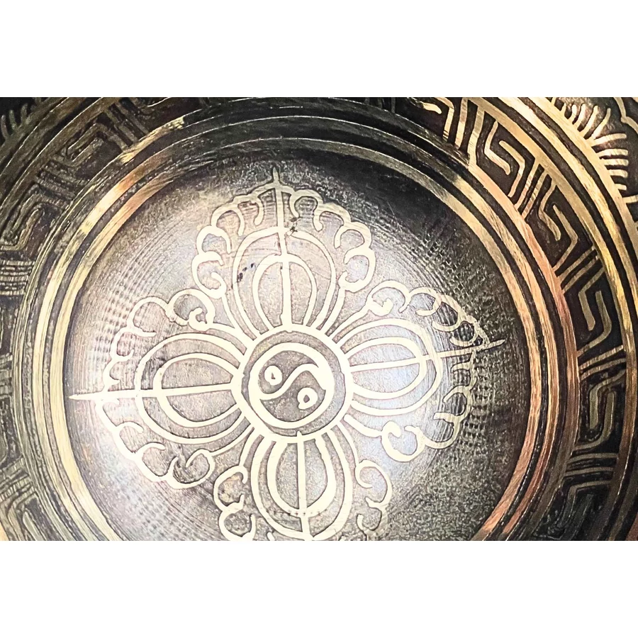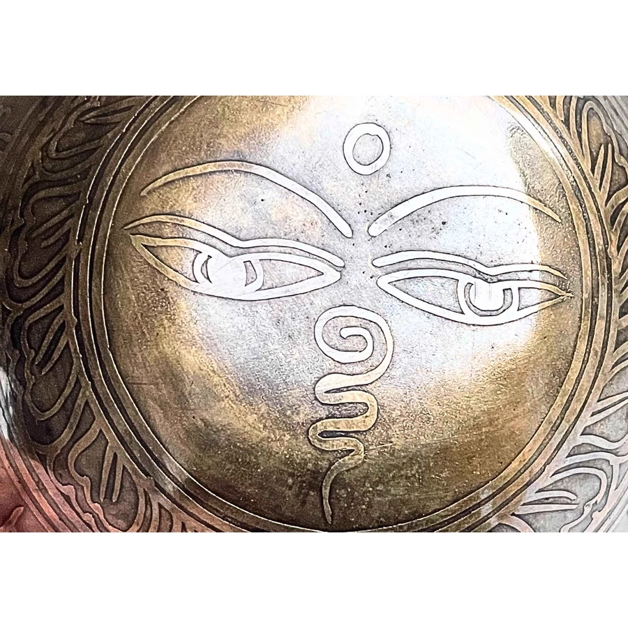 A tál belsejében a Dupla Dordzse szimbóluma ragyog – az erő, a stabilitás és a védelem jele. Az oldalán körbefut az Om Mani Padme Hum mantra, az együttérzés ősi hangrezgése. Az alján Buddha Bölcsességszeme figyel – tisztán, békésen, időtlenül.