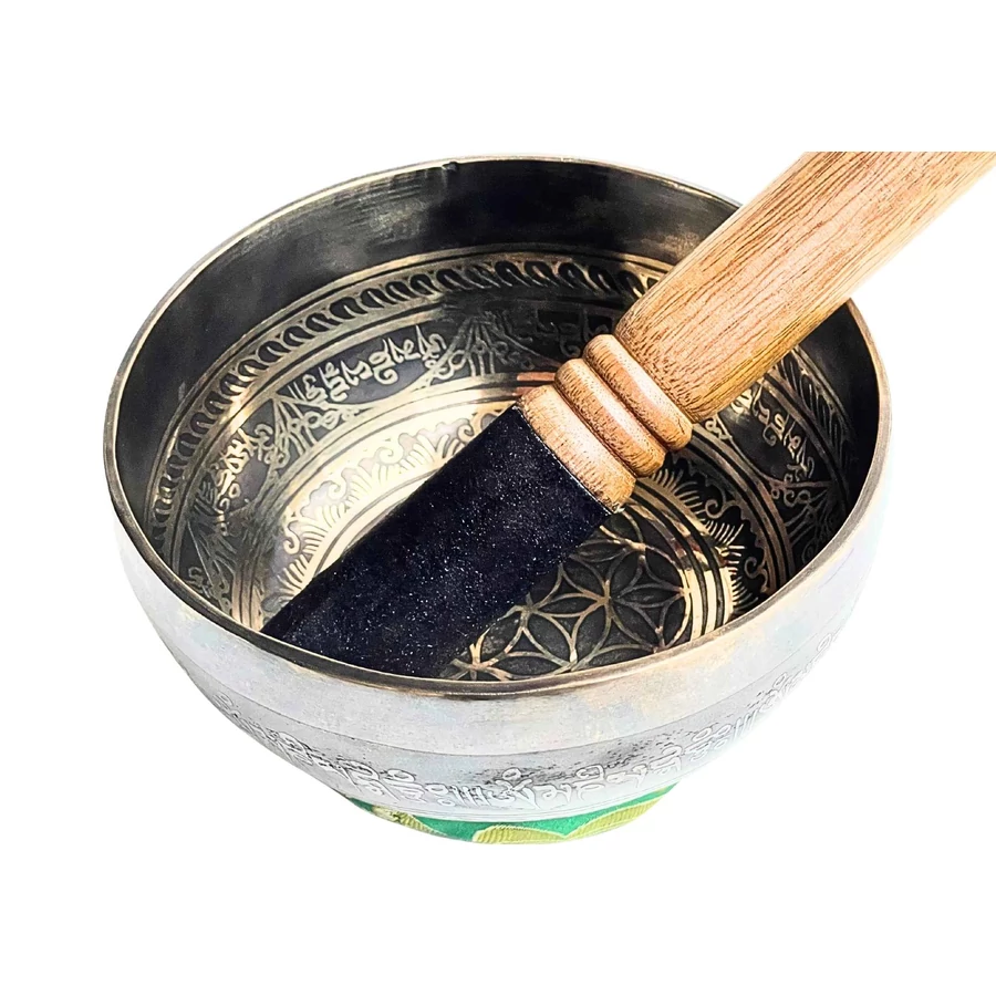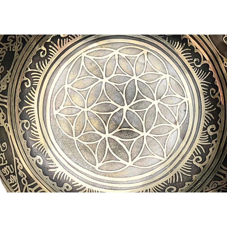 A belsejében az Élet Virága szimbólum ragyog – az egység és a teremtés mintája, ahol minden forma az élet ritmusára lélegzik. Az oldalán az Om Mani Padme Hum mantra fut körbe, az együttérzés és béke rezgését hordozva. Az alján a Végtelen Csomó díszíti: a létezés folytonos áramlásának és a mindenséggel való összekapcsolódásnak jelképe.