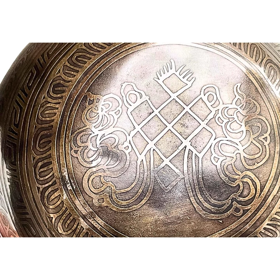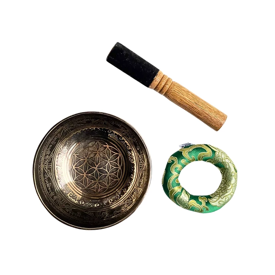 Amikor a bőrrel bevont faütő finoman megérinti, a hangtál mély, mégis ragyogó hangot szólaltat meg. E-hangon, 329 Hz-en rezeg – ez a napfonat csakra frekvenciája, ahol az életenergia, az önbizalom és a belső fény lakik. A hangja meleg, aranyló, mint a nap első sugara a bőrön. A rezgés finoman átfut a has közepén, és ébreszti a belső erőt.