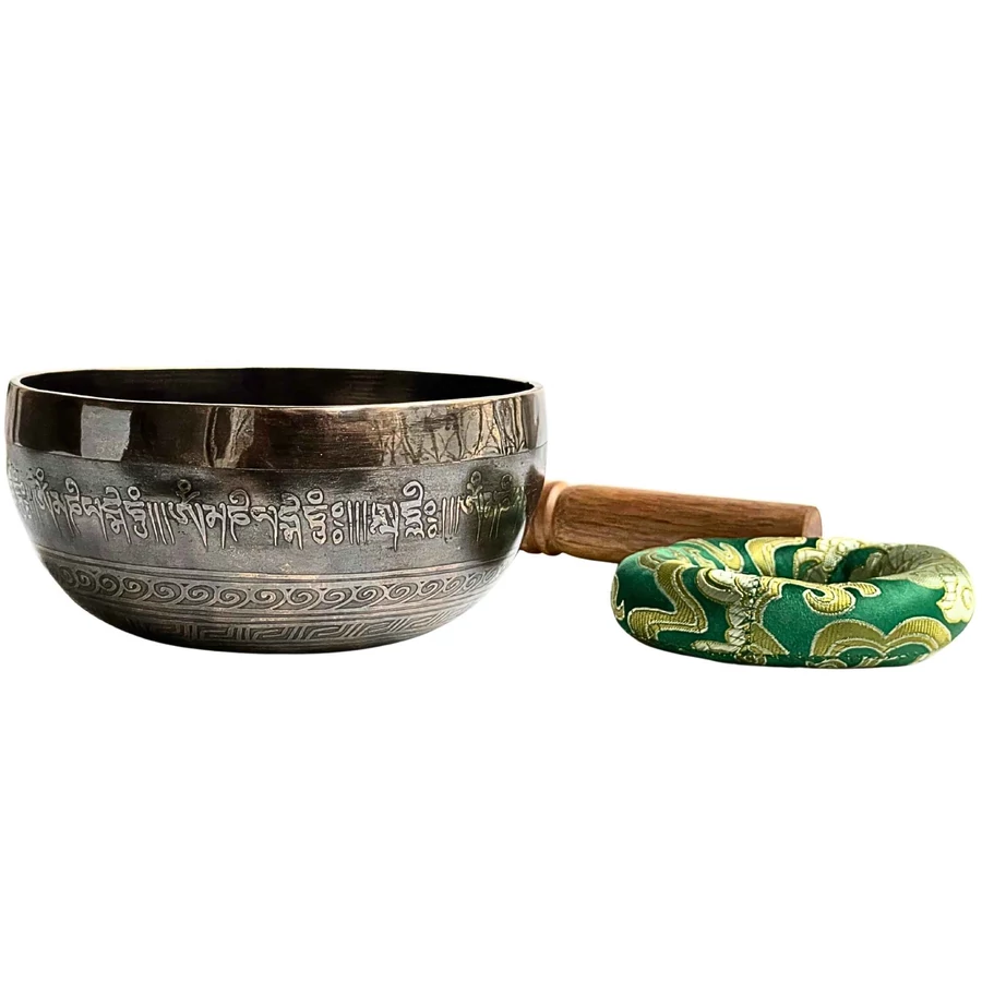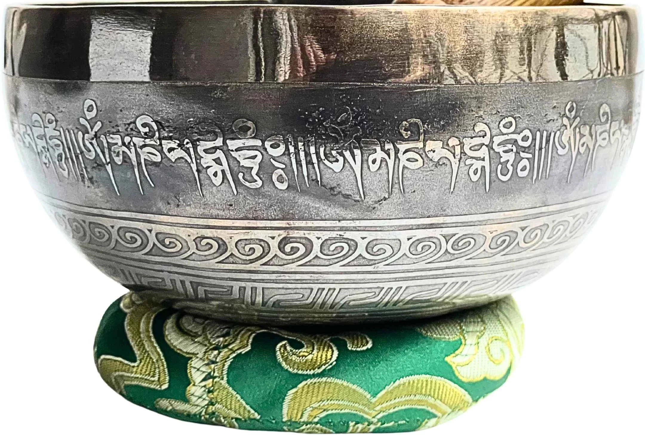 A hangtál zöld brokát alátéten pihen, a természet és egyensúly színében. A zöld a megújulás és a szívből fakadó nyugalom színe – a béke és az élet szeretetéé. Egyedi kidolgozású, kézzel formált darab, amely minden hangjával a jelen pillanatba hív.