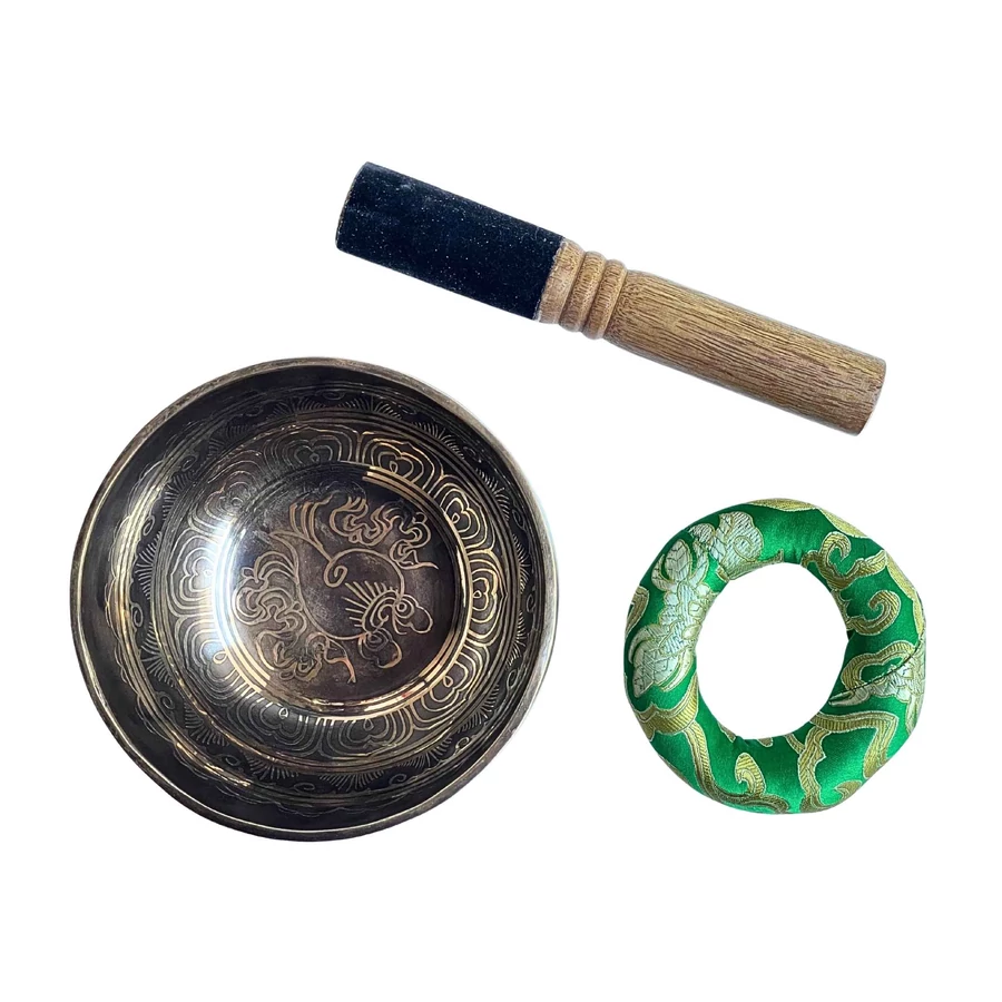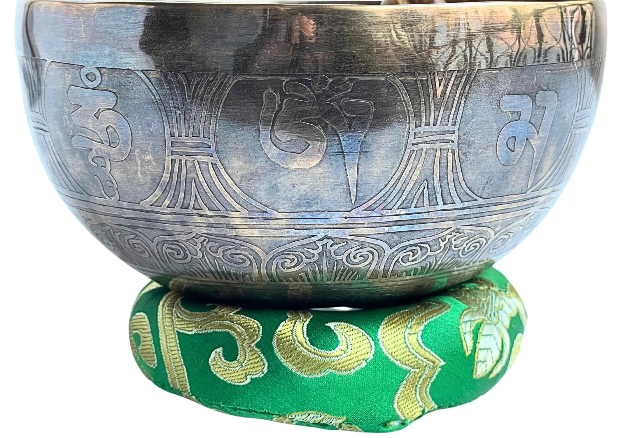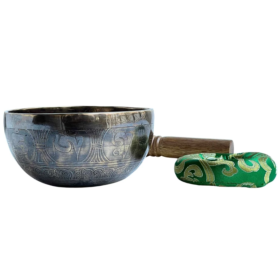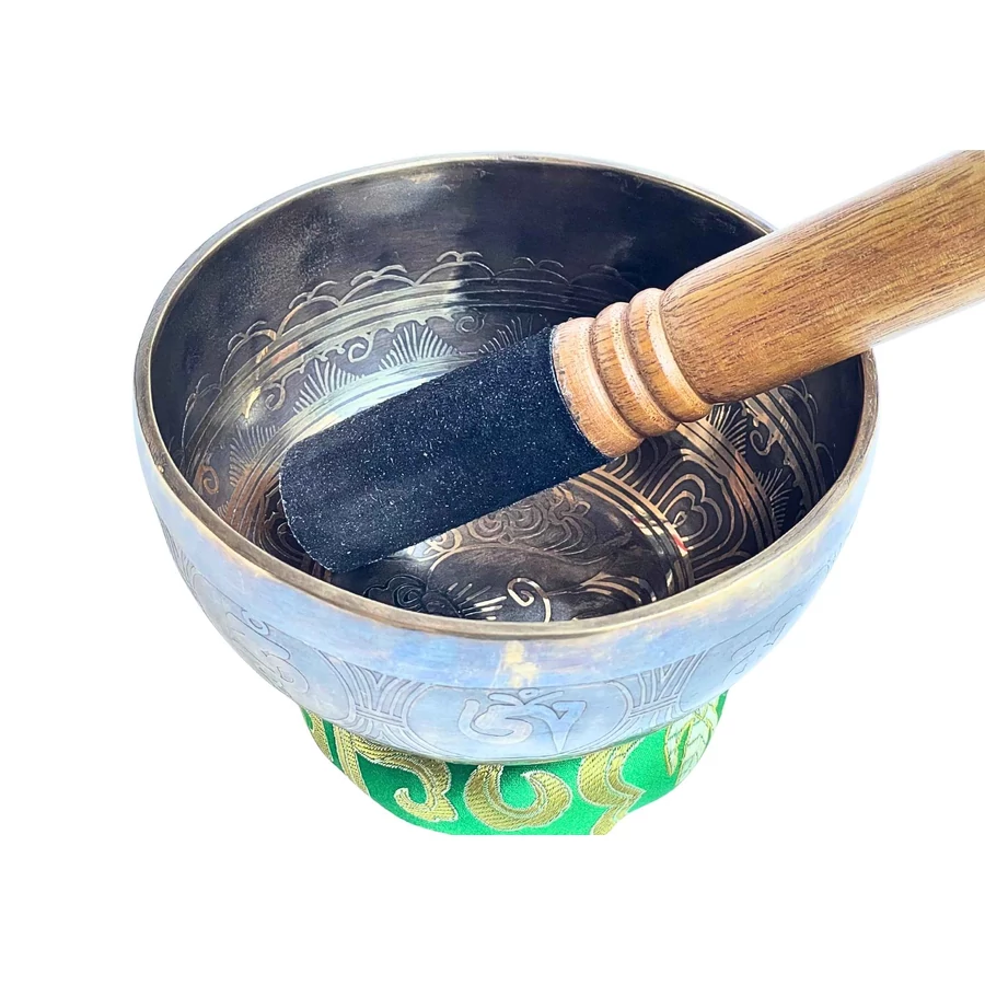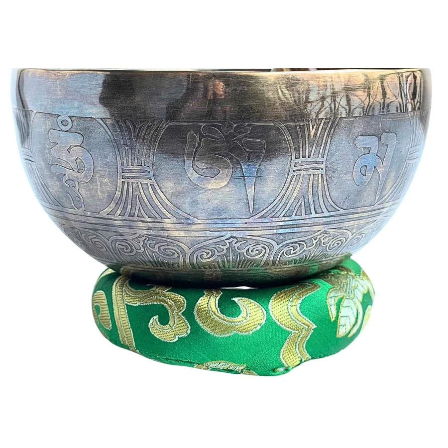 A hangtál zöld brokát alátéten pihen – a szín a természet harmóniáját és a szív bölcsességét hordozza. A zöld az egyensúly színe, amely segíti, hogy a koronacsakra energiája földet találjon – így a szellemi élmény a testben is otthonra leljen.