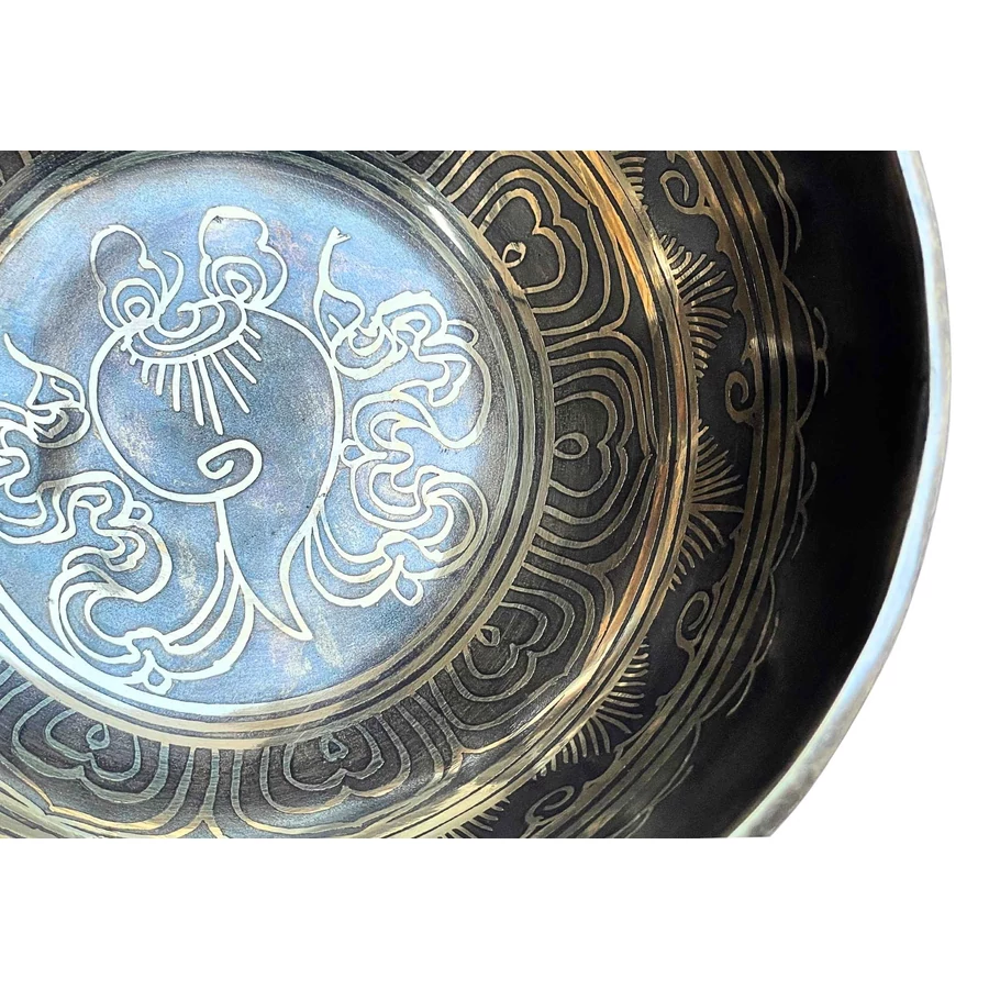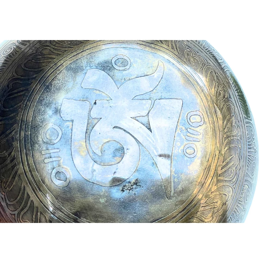 A hangtál belsejében a tibeti Kagyló szimbólum látható, a Nyolc Szerencsejel egyike. A kagyló a tanítások tiszta hangját jelképezi – azt a hívást, amely messzire hangzik, és minden lényt a tudatosság fényébe vezet. Az oldalát az Om Mani Padme Hum mantra futja körbe – a bölcsesség, együttérzés és tiszta tudat szent rezgése. Az alján a tibeti OM szótag ragyog, a teremtés ősrezgésének jelképe.