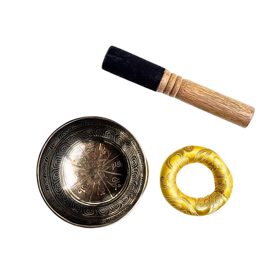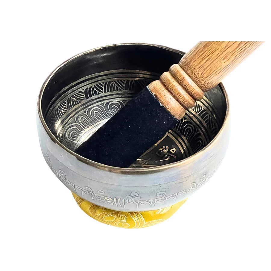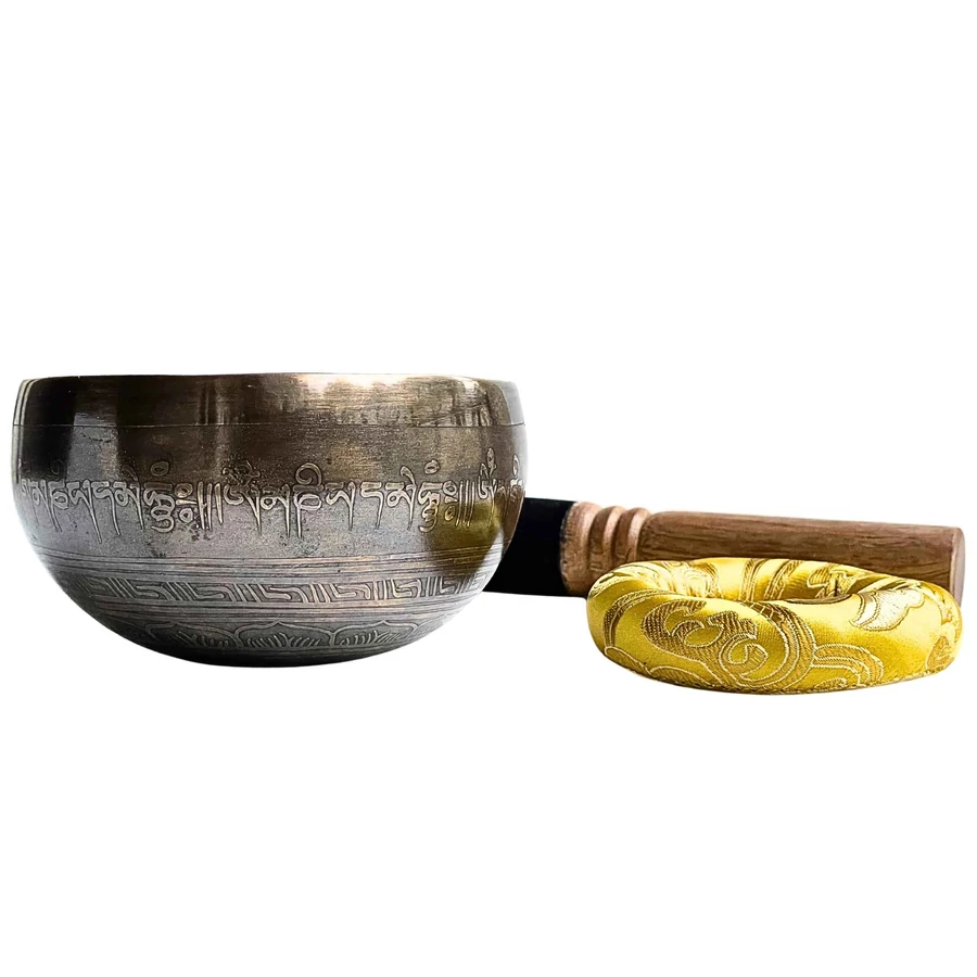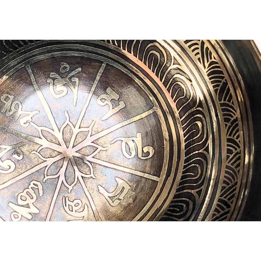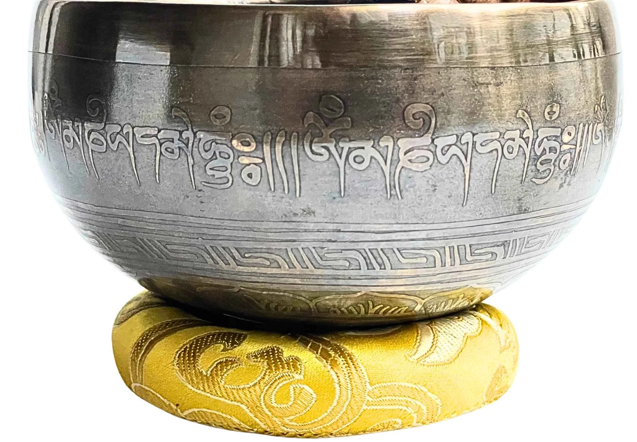 A tál belsejét és oldalát az Om Mani Padme Hum mantra díszíti – a könyörület és tisztaság ősi rezgése, mely minden hanggal újra feléled. Az alján egy szanszkrit szótag őrzi a hang szent forrását, a lét tiszta magját.