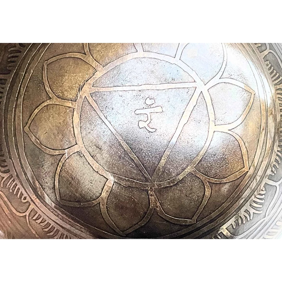 Amikor a bőrrel bevont faütő megérinti, a hangtál lágyan megszólal: E-hangon, 1318 Hz-en rezeg, a napfonat csakra aranyló fényét idézve. Ez a hang meleg, élettel teli és felszabadító. Érzed, ahogy a tested közepén felgyullad egy apró láng – a belső erő, önbizalom és nyugalom fénye.