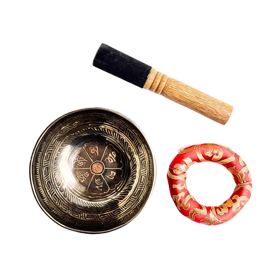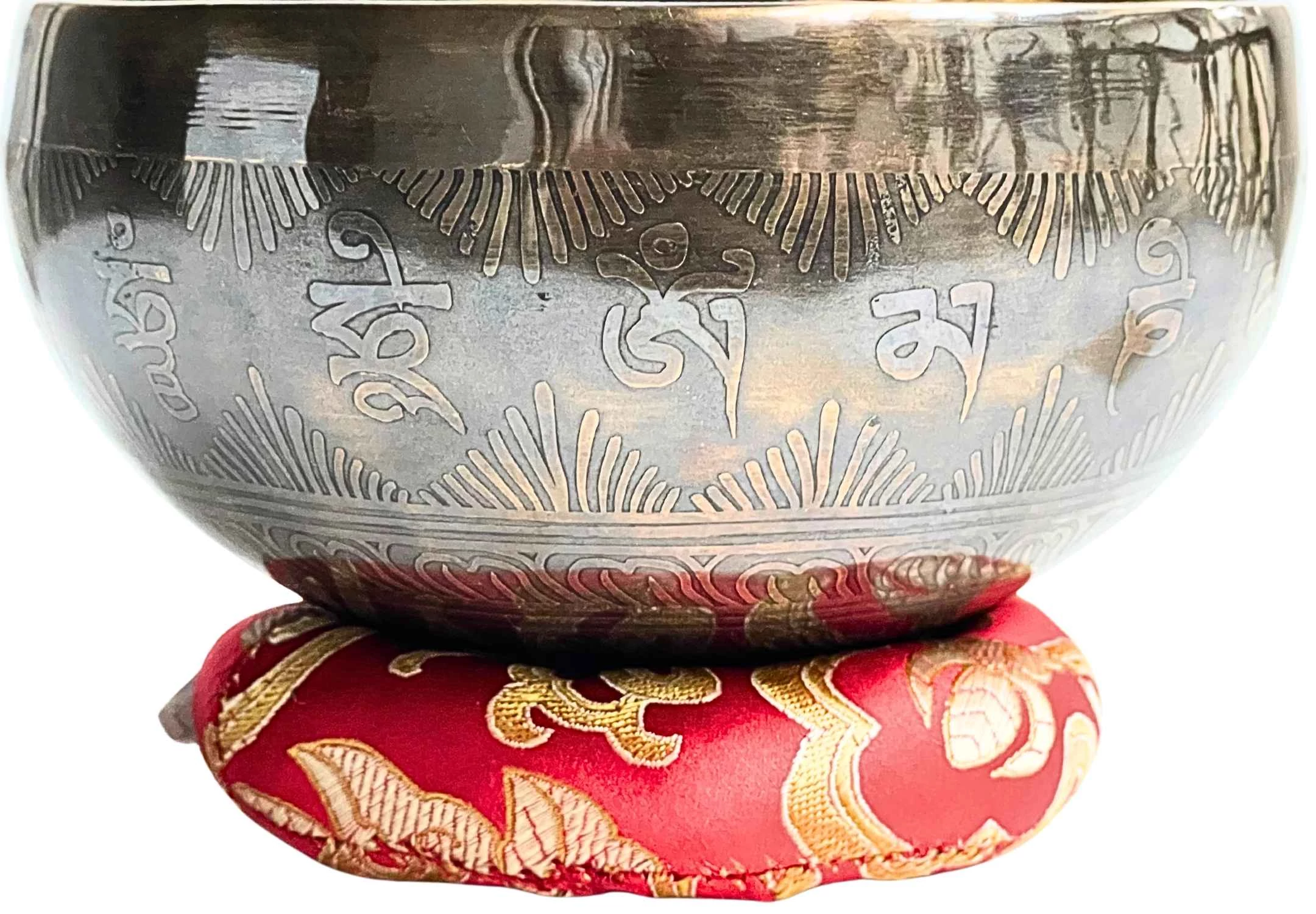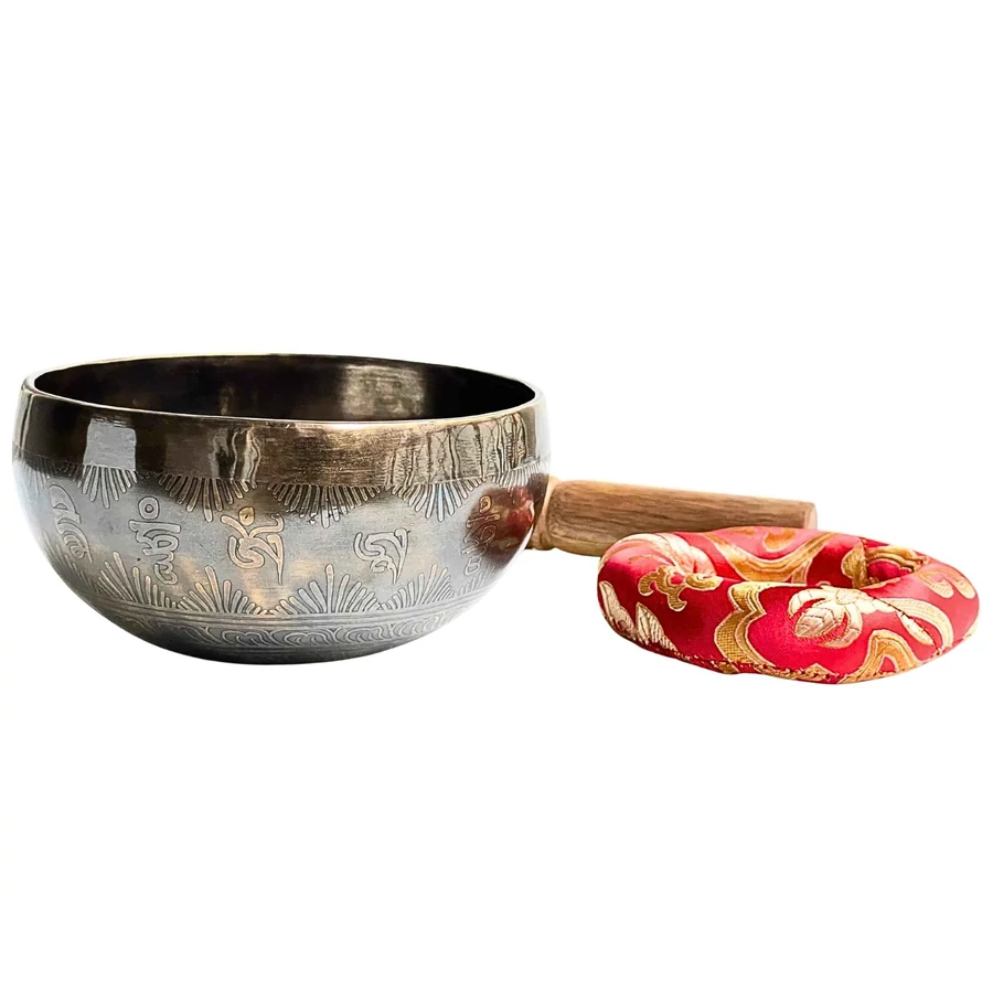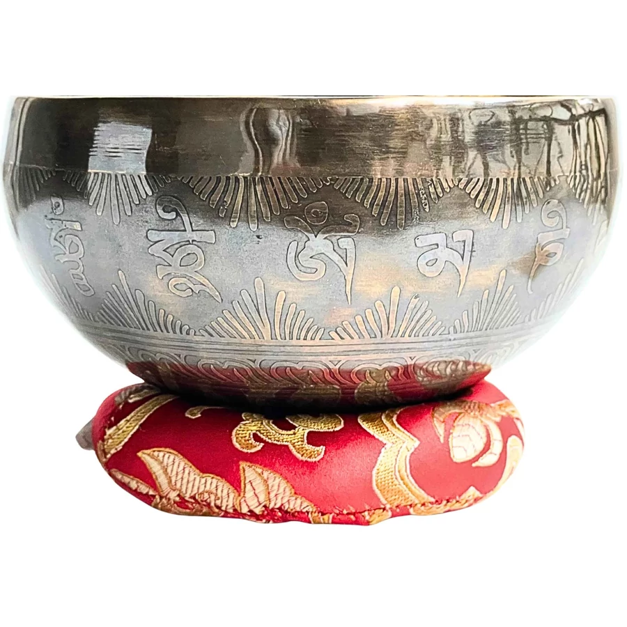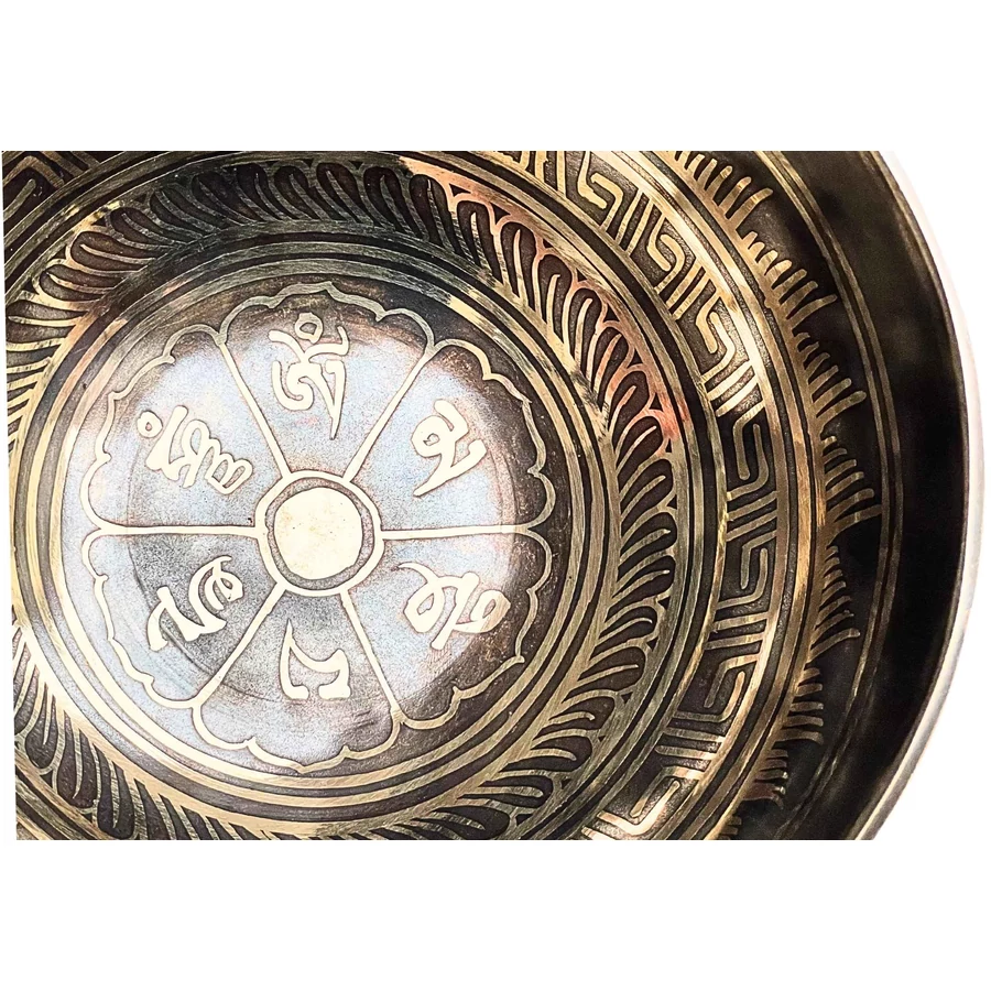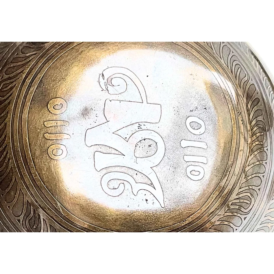 A tál belsejét és oldalát az Om Mani Padme Hum mantra öleli körbe – az együttérzés és tisztaság ősi rezgése, amely minden hangban újra megszületik. Az alján a tibeti OM szótag ragyog, az univerzum első rezdülésének szimbóluma, a teremtő hang forrása.