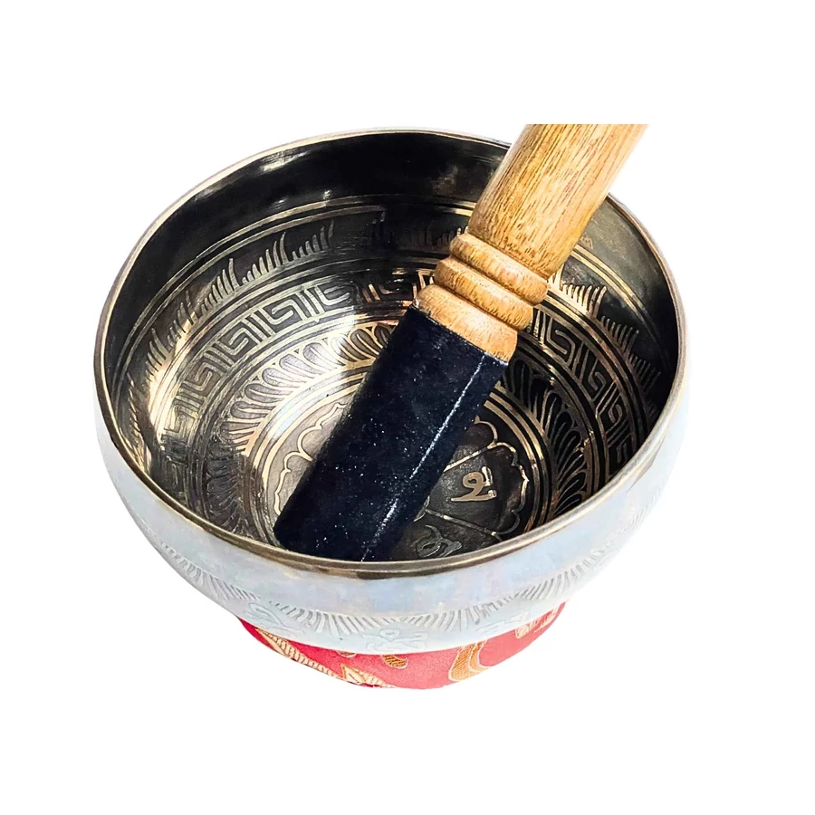 A hangtál piros brokát alátéten pihen – a szín az élet erejét, a szív melegét és a tudat fényét egyesíti. Egyedi, kézzel készült darab, minden részlete harmóniát és jelenlétet sugároz.
