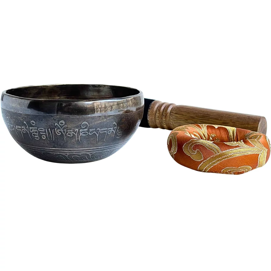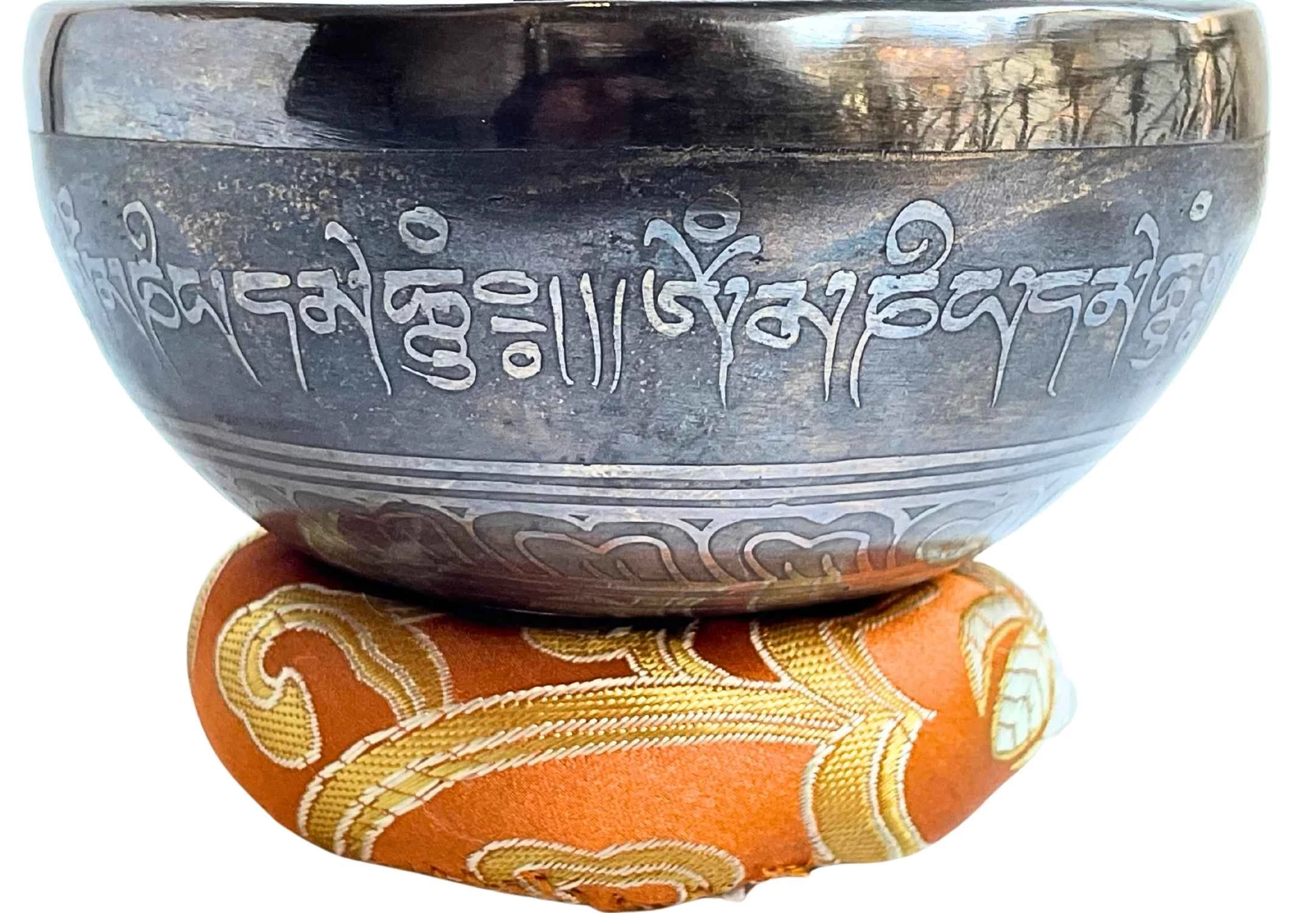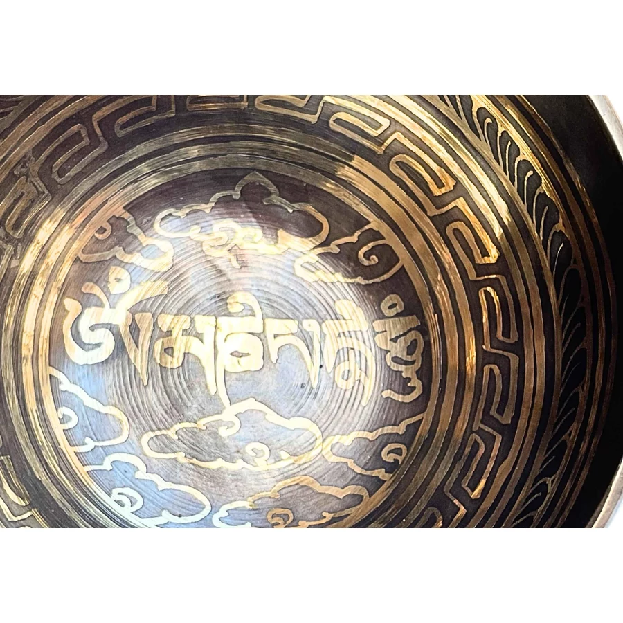 A hangtál belsejét és oldalát az Om Mani Padme Hum mantra díszíti – az együttérzés, a béke és a bölcsesség rezgése. Az alján a tibeti OM szótag ragyog, az univerzum ősrezgésének jelképe, a hang, amelyből minden teremtés születik.