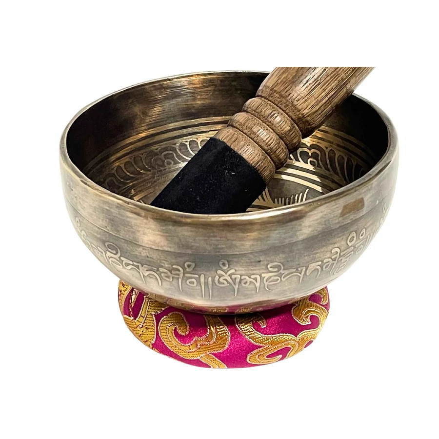 A bíbor brokát alátéten a hang még simábbá válik. A szín mély, puha, elegáns. Támaszt ad a tál rezgéseinek, mintha egy finom, meleg tenyér tartaná alulról. A perem csengése fényesen indul, majd lassú, édes rezgésbe omlik. Még akkor is érzed, amikor a hang már lecsengett.