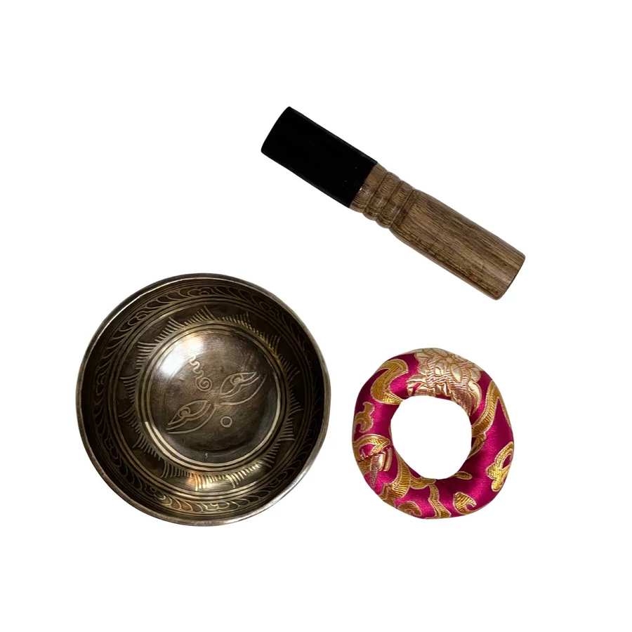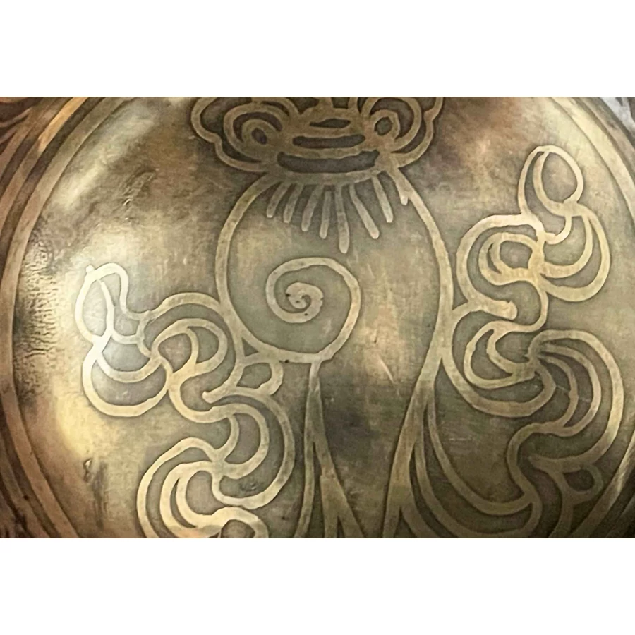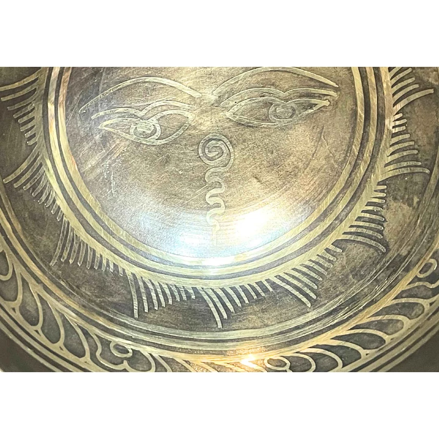 A tál belsejében a Buddha Bölcsességszeme figyel. Lágy és éber jelenléttel. Az alján a tibeti Kagyló szimbóluma spirálként nyílik felfelé, mintha a hang útját mutatná – onnan indul, ahol a csend születik, és oda érkezik meg, ahol te önmagadra találsz.