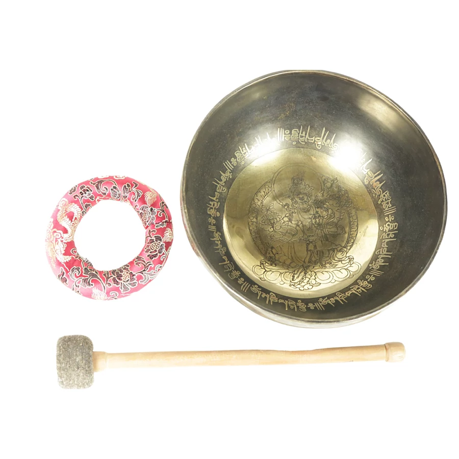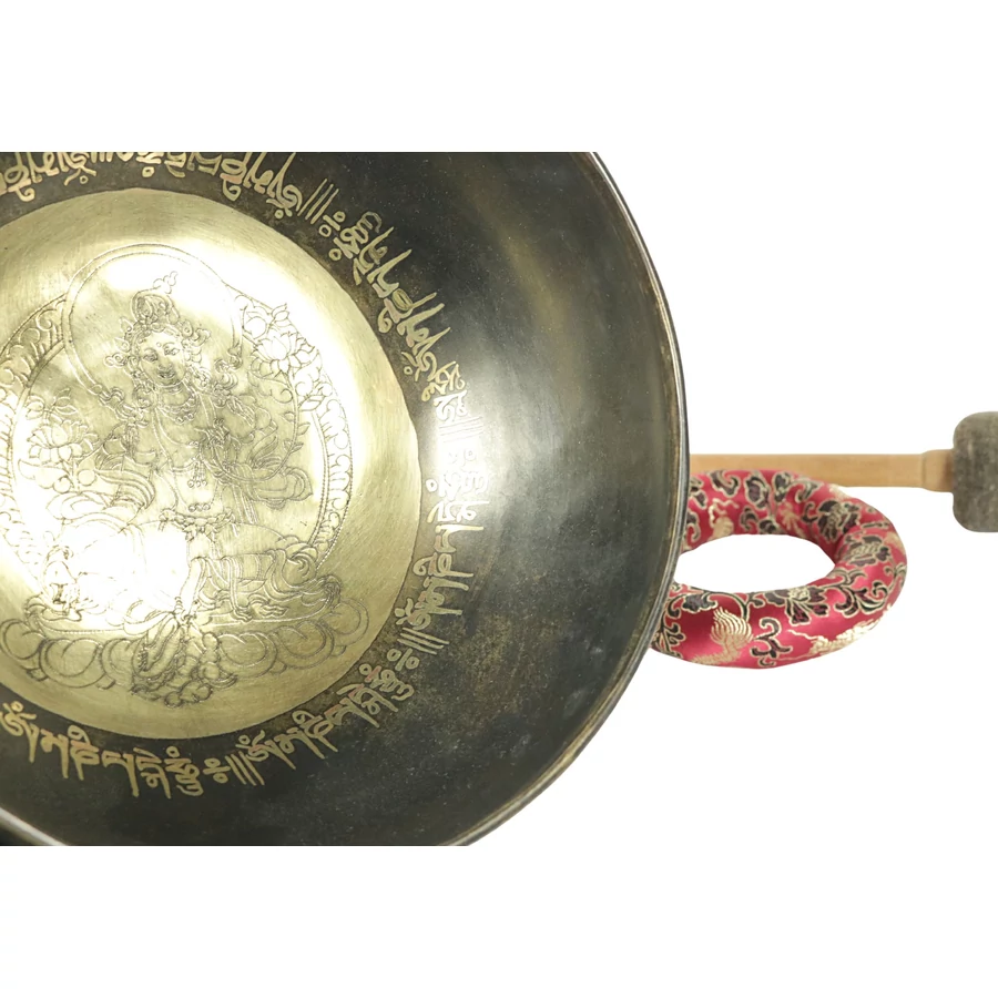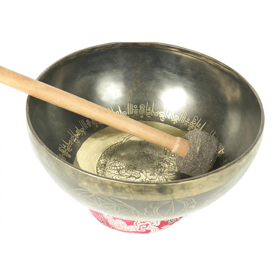 Zöld Tara tibeti mantrás hangtál 7 fémből piros színű brokáttal és ütővel - videoval